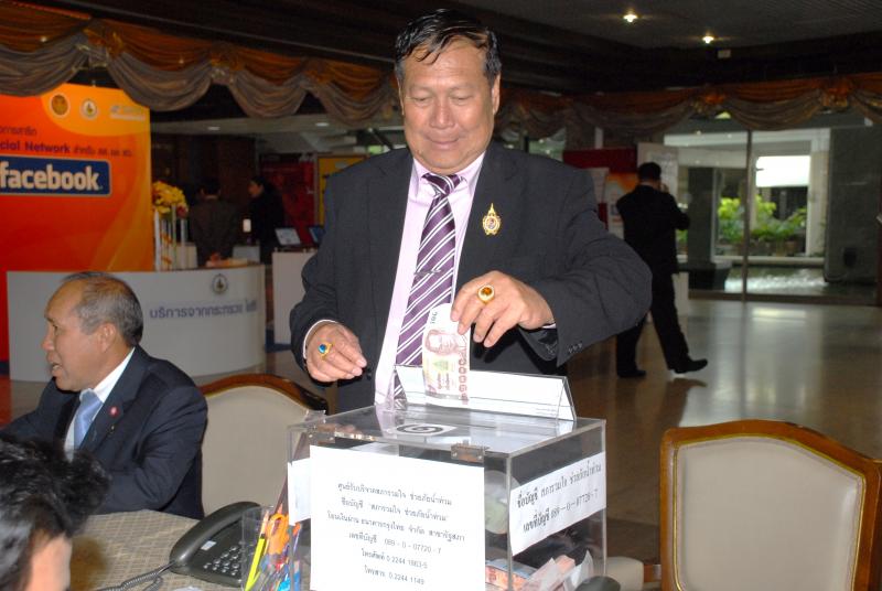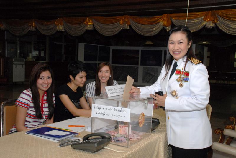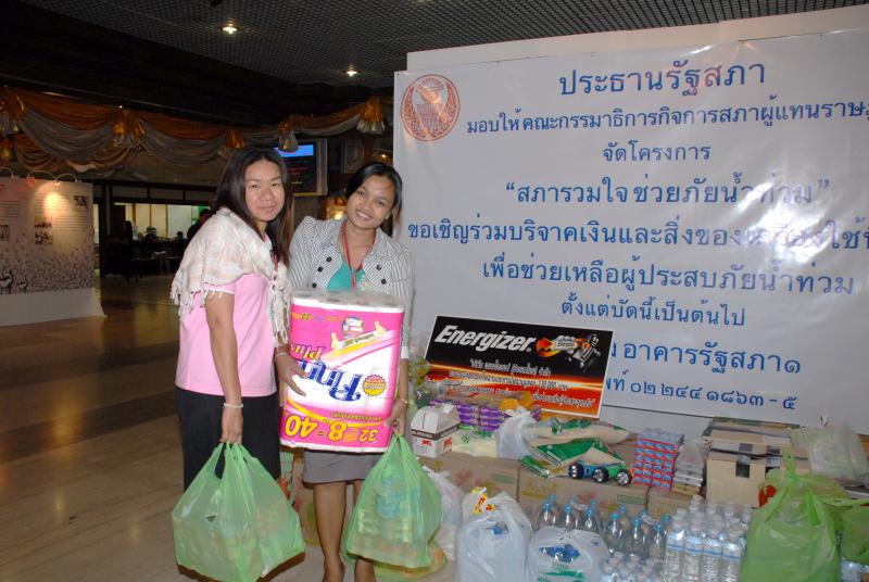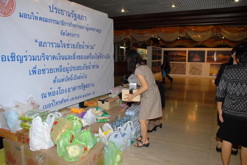 | ประธานรัฐสภา มอบให้คณะกรรมาธิการกิจการสภาผู้แทนราษฎร จัดโครงการ "สภารวมใจ ช่วยภัยน้ำท่วม" ตั้งโต๊ะรับบริจาคเงินและสิ่งของเครื่องใช้ที่จำเป็นเพื่อช่วยเหลือผู้ประสบภัยน้ำท่วม ณ บริเวณห้องโถงชั้นล่าง อาคารรัฐสภา ๑ |