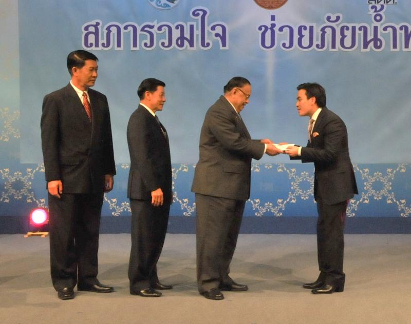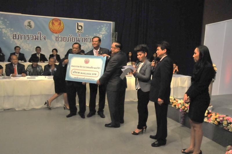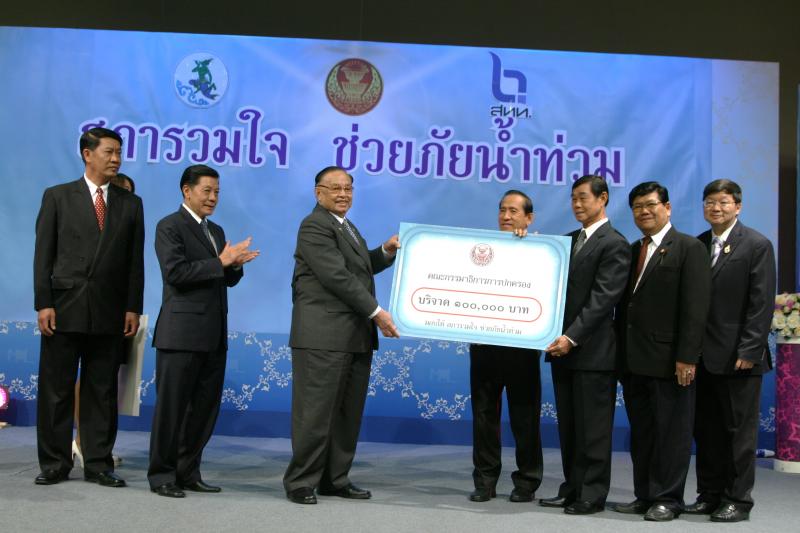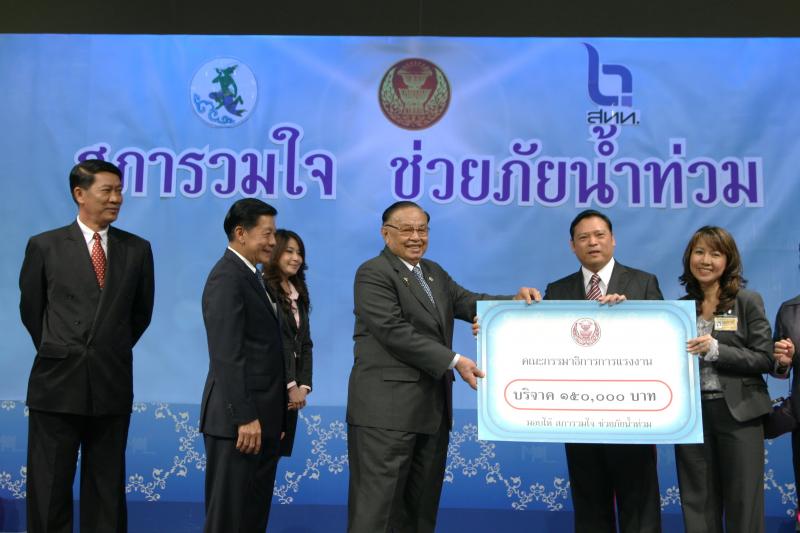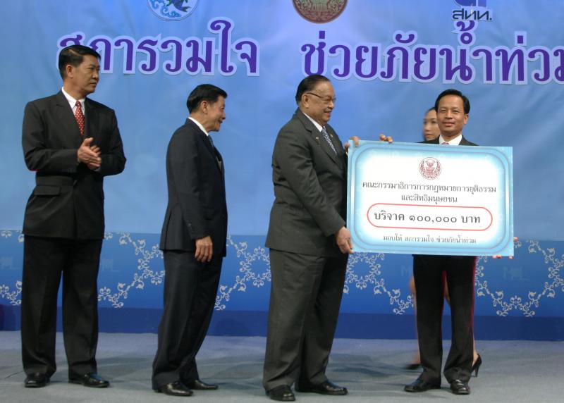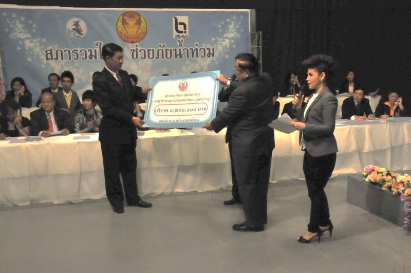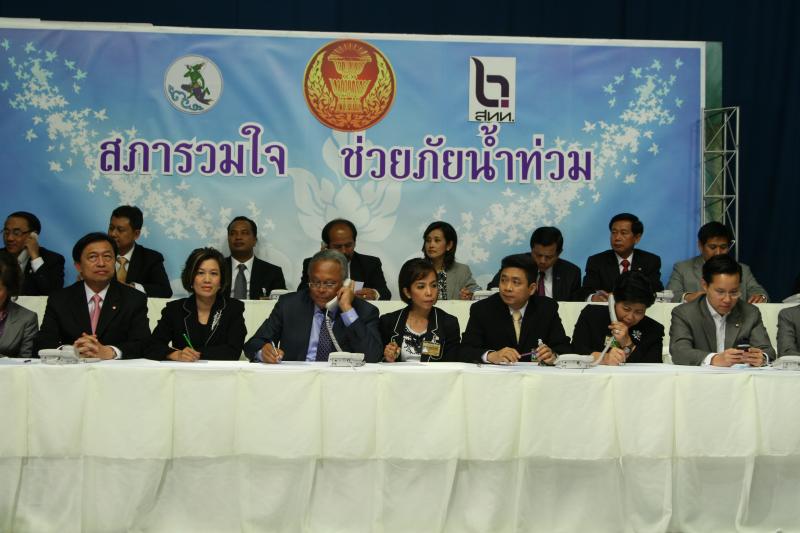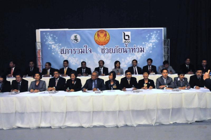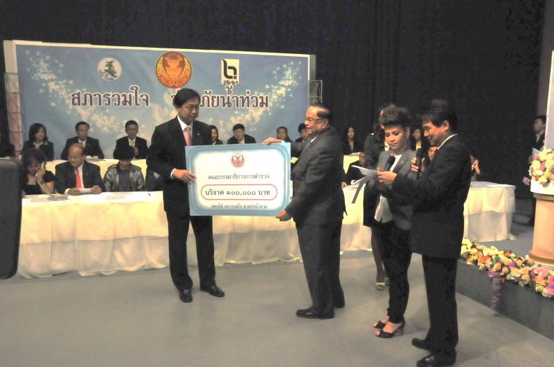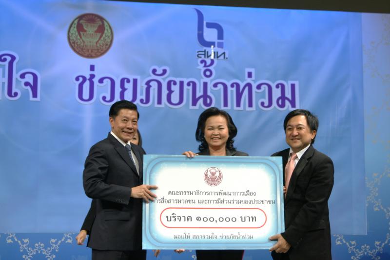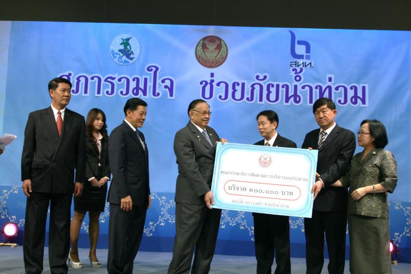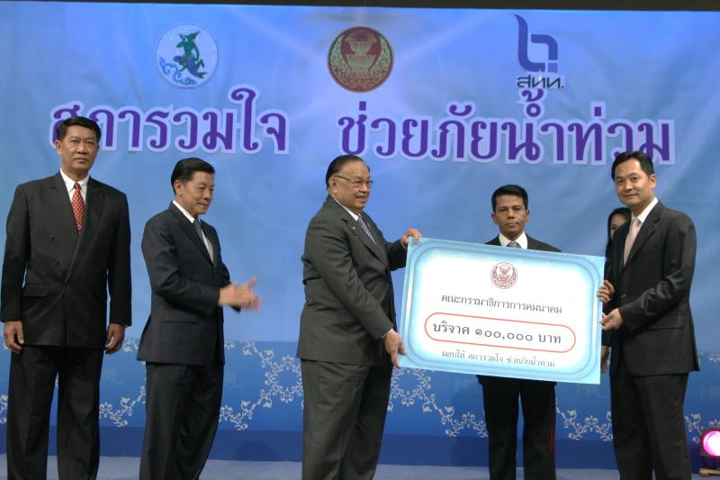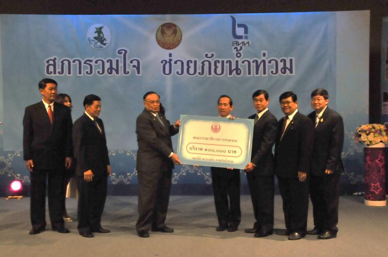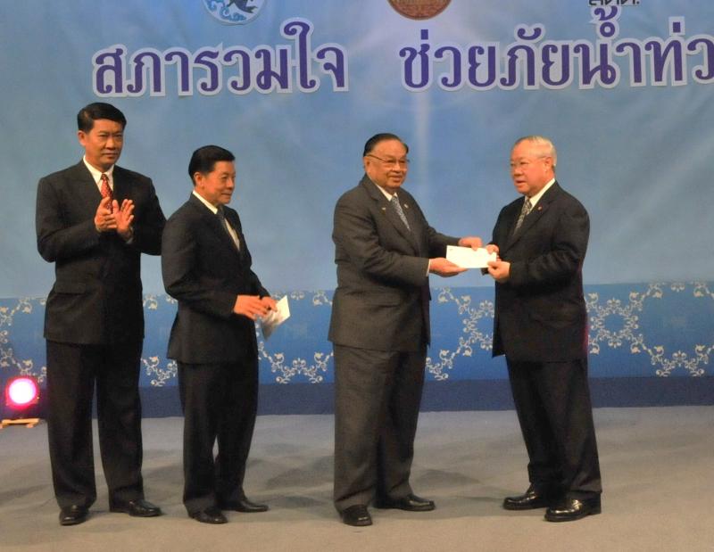 | วันพุธที่ ๑๐ พฤศจิกายน ๒๕๕๓ รัฐสภาโดยคณะกรรมการดำเนินการให้ความช่วยเหลือผู้ประสบอุทกภัย ซึ่งนายศักดา คงเพชร ประธานคณะกรรมาธิการกิจการสภาผู้แทนราษฎร เป็นประธานได้จัดรายการพิเศษ "สภารวมใจ ช่วยภัยน้ำท่วม" ถ่ายทอดสดทางสถานีโทรทัศน์แห่งประเทศไทย กรมประชาสัมพันธ์ โดยมีนายชัย ชิดชอบ ประธานรัฐสภา เป็นประธานในการรับมอบเงินบริจาค จากคณะกรรมาธิการสามัญประจำสภาผู้แทนราษฎร จำนวน ๓๕ คณะ เป็นเงินจำนวน ๔ ล้านกว่าบาท และรับมอบเงินบริจาค จากนายธนินทร์ เจียรวนนท์ ประธานกรรมการและประธานคณะผู้บริหารเครือเจริญโภคภัณฑ์ เป็นเงินจำนวน ๕ ล้านบาท โดยการจัดรายการดังกล่าวมีผู้มีจิตศรัทธาจากภาคส่วนต่าง ๆ ร่วมบริจาคผ่านรายการเป็นเงินจำนวน ๑๖ ล้าน ๘ แสนกว่าบาท ซึ่งจะได้นำไปจัดหาเครื่องอุปโภค บริโภค และสิ่งของจำเป็นเพื่อช่วยเหลือผู้ประสบภัยน้ำท่วมต่อไป |