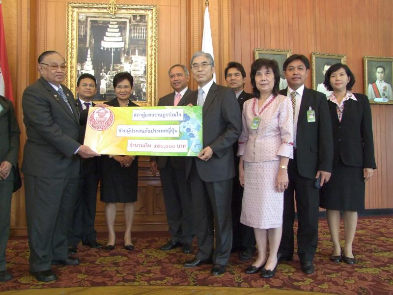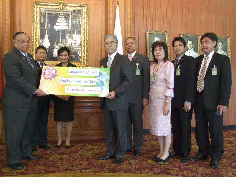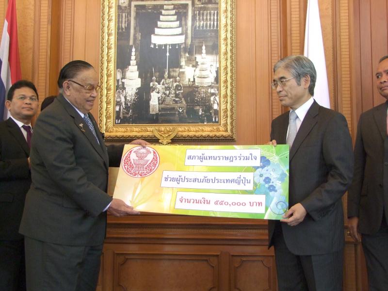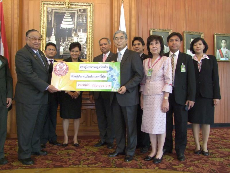 | วันศุกร์ที่ ๒๕ มีนาคม ๒๕๕๔ เวลา ๑๓.๓๐ นาฬิกา ณ หน้าห้องประชุมรัฐสภา ชั้น๒ อาคารรัฐสภา ๑ นายชัย ชิดชอบ ประธานรัฐสภา และประธานสภาผู้แทนราษฎร เป็นประธานในการมอบเงินช่วยเหลือผู้ประสบภัยแผ่นดินไหว-สึนามิ ประเทศญี่ปุ่น จำนวน ๕๕๐,๐๐๐ บาทในนาม "สภาผู้แทนราษฎร" พร้อมด้วยข้าราชการชั้นผู้ใหญ่ของสำนักงานเลขาธิการสภาผู้แทนราษฎร โดยมีนายเซอิจิ โคจิมะ เอกอัครราชทูตญี่ปุ่นประจำประเทศไทย เป็นผู้รับมอบ |