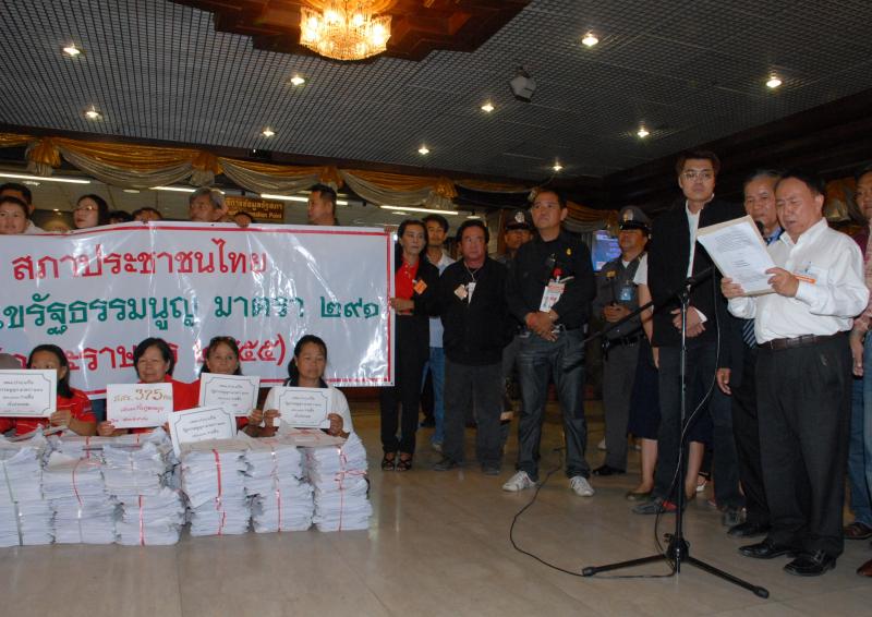 | วันพุธที่ ๒๕ มกราคม ๒๕๕๕ เวลา ๑๐.๓๐ นาฬิกา ณ บริเวณห้องโถงชั้นล่าง อาคารรัฐสภา ๑ นายสมศักดิ์ เกียรติสุรนนท์ ประธานรัฐสภาและประธานสภาผู้แทนราษฎร พร้อมด้วยนายวัฒนา เซ่งไพเราะ โฆษกสภาผู้แทนราษฎร และนายซูการ์โน มะทา ที่ปรึกษาประธานสภาผู้แทนราษฎรรับยื่นร่างรัฐธรรมนูญแห่งราชอาณาจักรไทยแก้ไขเพิ่มเติม (ฉบับที่...) พ.ศ. ...พร้อมรายชื่อประชาชนจำนวน ๖๕,๔๐๐ รายชื่อจากทั่วประเทศจากนายเยี่ยมยอด ศรีมันตะ ประธานสภาประชาชนไทยเพื่อแก้ไขรัฐธรรมนูญ มาตรา๒๙๑ พร้อมคณะ |