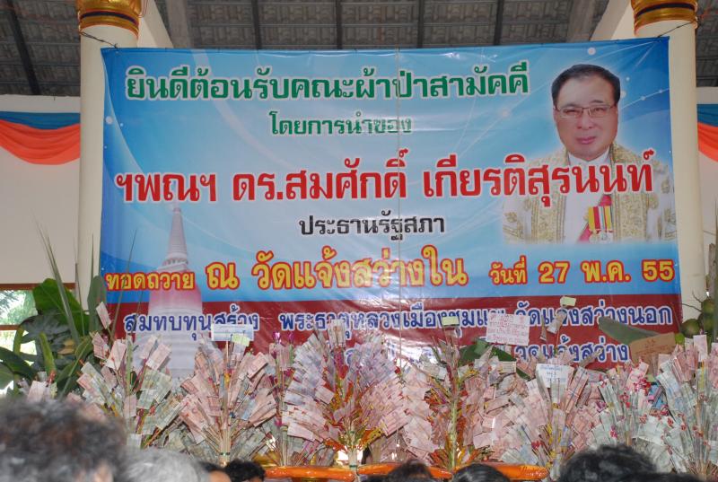 วันอาทิตย์ที่ ๒๗ พฤษภาคม ๒๕๕๕ เวลา ๐๙.๐๐ นาฬิกา  ณ  วัดแจ้งสว่างใน  ตำบลโนนหัน  อำเภอชุมแพ  จังหวัดขอนแก่น  นายสมศักดิ์  เกียรติสุรนนท์  ประธานรัฐสภา  และประธานสภาผู้แทนราษฎร  เป็นประธานในพิธีทอดผ้าป่าสามัคคี ณ วัดแจ้งสว่างใน  ตำบลโนนหัน อำเภอชุมแพ  จังหวัดขอนแก่น