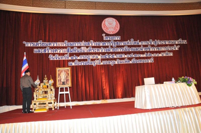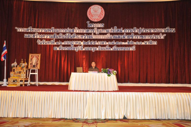 วันจันทร์ที่ ๑๖ กรกฎาคม ๒๕๕๕ เวลา ๐๘.๓๐ - ๒๒.๐๐ นาฬิกา  ณ ห้องรอยัลจูบิลี่  บอลรูม อิมแพ็ค เมืองทองธานี  นายสมศักดิ์  เกียรติสุรนนท์  ประธานรัฐสภา และประธานสภาผู้แทนราษฎร  เป็นประธานในพิธีเปิดโครงการ "การเตรียมความพร้อมการก่อสร้างอาคารรัฐสภาแห่งใหม่ การเข้าสู่ประชาคมอาเซียน และสร้างความสัมพันธ์อันดีระหว่างฝ่ายการเมืองและฝ่ายข้าราชการประจำ"