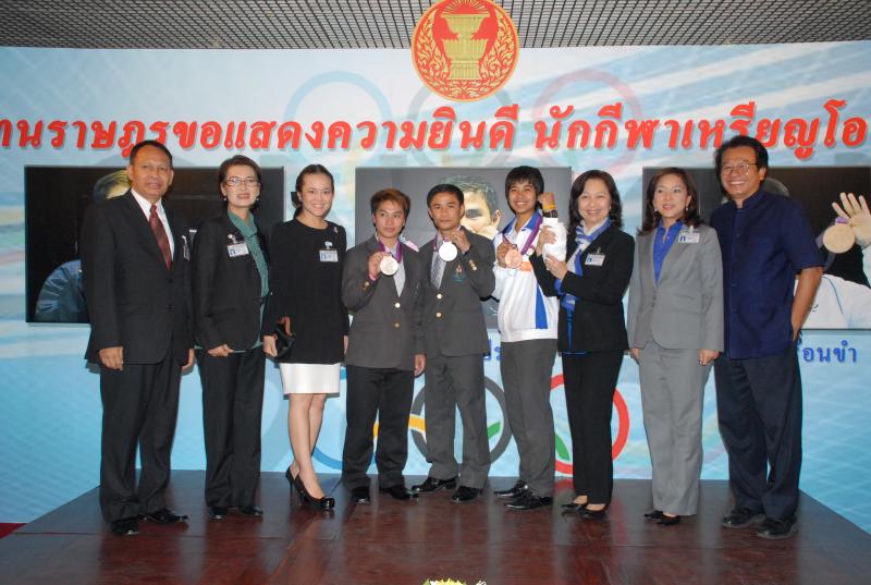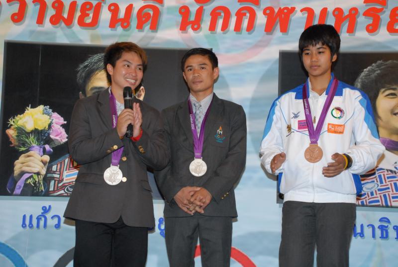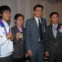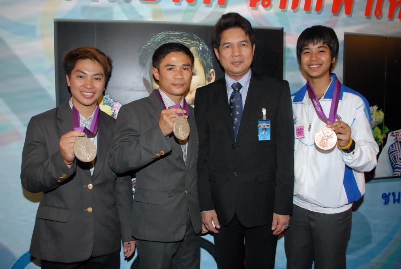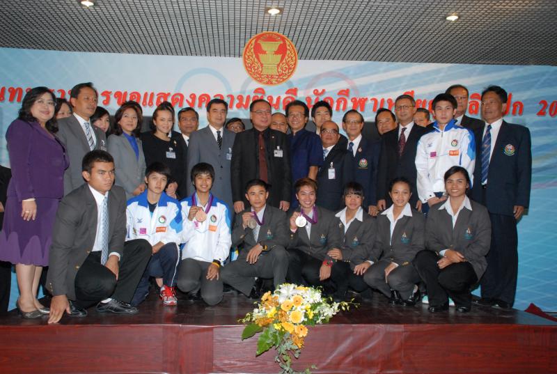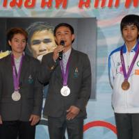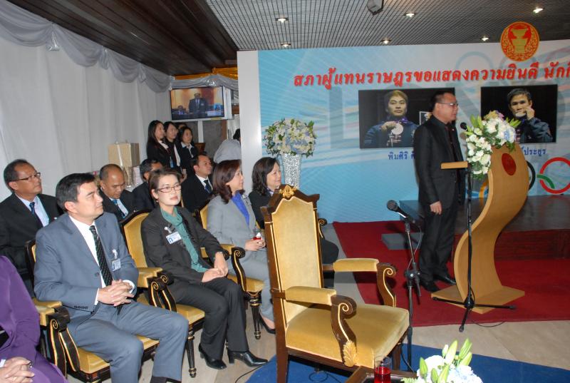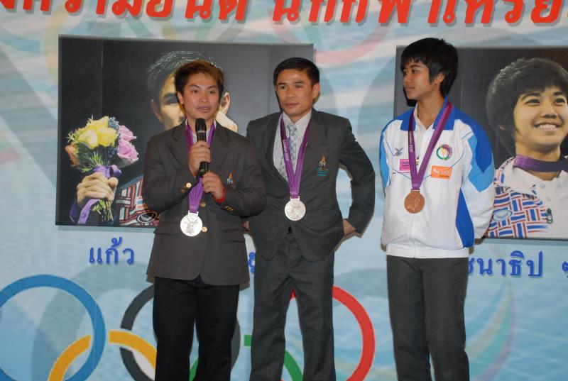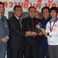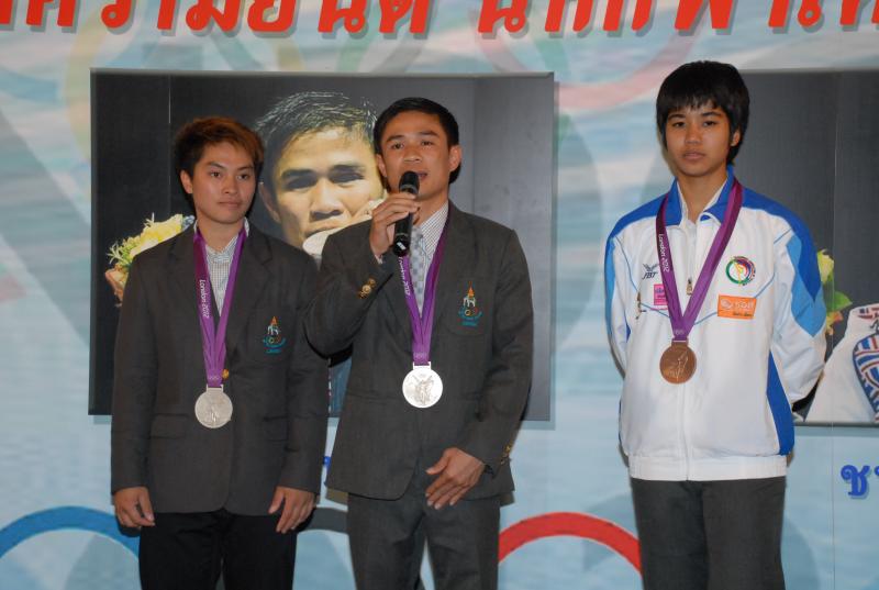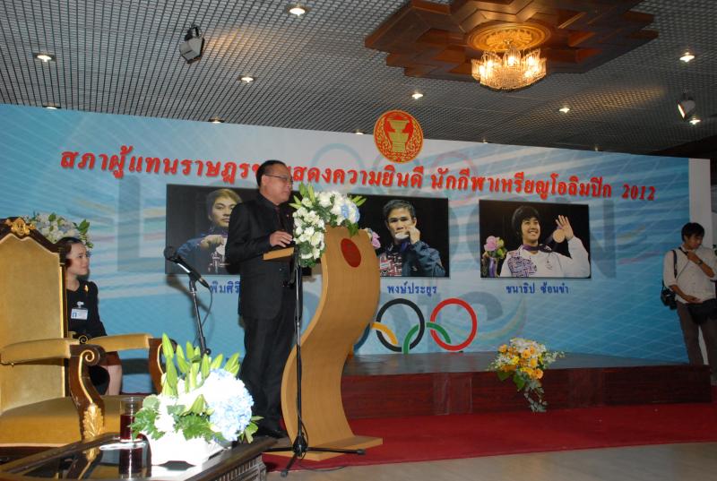 วันพุธที่ ๒๒ สิงหาคม ๒๕๕๕ เวลา ๑๔.๐๐ นาฬิกา ณ บริเวณห้องโถง อาคารรัฐสภา ๑ นายสมศักดิ์ เกียรติสุรนนท์ ประธานรัฐสภา และประธานสภาผู้แทนราษฎร ให้การรับรองและจัดพิธีต้อนรับ พร้อมแสดงความยินดีกับนักกีฬาที่ได้รับเหรียญรางวัลกีฬาโอลิมปิก ครั้งที่ ๓๐ ลอนดอนเกมส์ ๒๐๑๒ ต่อทัพนักกีฬาตัวแทนประเทศไทยที่เข้าร่วมการแข่งขัน นำโดย ร้อยตรี แก้ว พงษ์ประยูร นักกีฬามวยสมัครเล่น เหรียญเงิน น.ส.พิมศิริ ศิริแก้ว นักกีฬายกน้ำหนัก เหรียญเงิน น.ส.ชนาธิป ซ้อนขำ นักกีฬาเทควันโด เหรียญทองแดง โดยประธานรัฐสภาได้มอบเงินรางวัลและของที่ระลึกแก่นักกีฬาที่ได้รับเหรียญ โดยเหรียญเงินคนละ ๔ แสนบาท เหรียญทองแดงคนละ ๒ แสนบาท พร้อมให้ โอวาทต่อนักกีฬาว่า นักกีฬาผู้ได้รับรางวัลล้วนเป็นตัวอย่างให้คนไทยเห็นว่าความพยายามอยู่ที่ไหน ความสำเร็จอยู่ที่นั่น ขณะเดียวกันความสำเร็จที่เกิดขึ้นนี้นับเป็นความสำเร็จของคนไทยทั้งชาติ ทำให้คนทั้งชาติได้ภาคภูมิใจและมีความสุข จึงขอฝากให้เป็นตัวอย่างที่ดีกับวัยรุ่นไทยต่อไป รวมถึงนักกีฬาที่ไม่ได้เหรียญรางวัล ถือว่าสามารถชนะใจคนไทยทุกคนพร้อมขอเป็นกำลังใจสำหรับความสำเร็จที่รออยู่ข้างหน้า ด้าน ร้อยตรี แก้ว พงษ์ประยูร กล่าวขอบคุณประธานรัฐสภาในนามตัวแทนนักกีฬาไทยว่า จะนำโอวาทที่ได้รับไปพัฒนาตนเองเพื่อสร้างชื่อเสียงให้กับประเทศชาติต่อไป