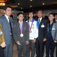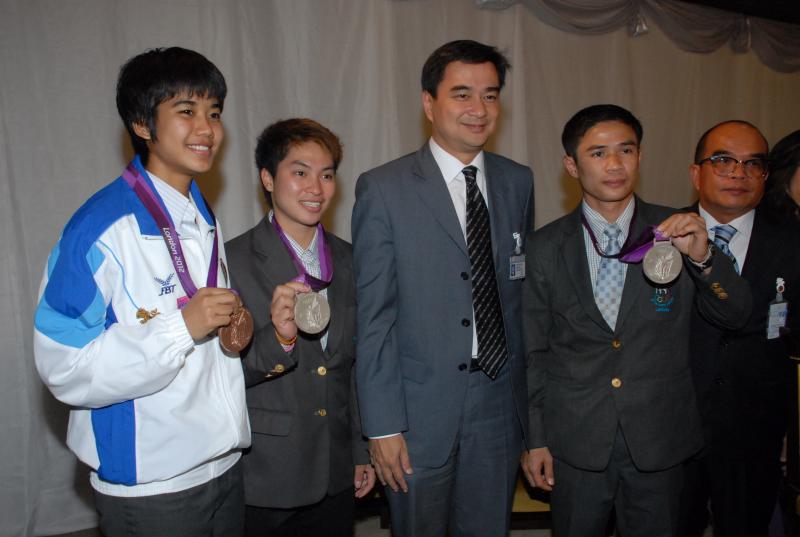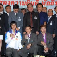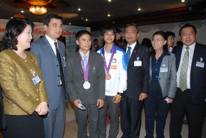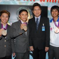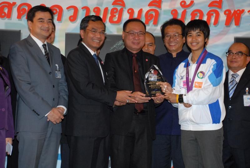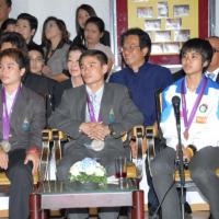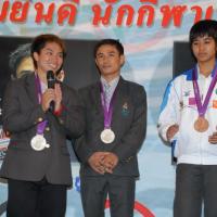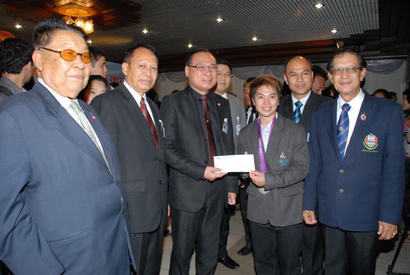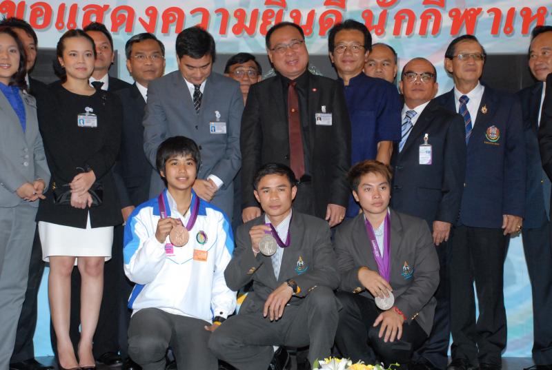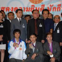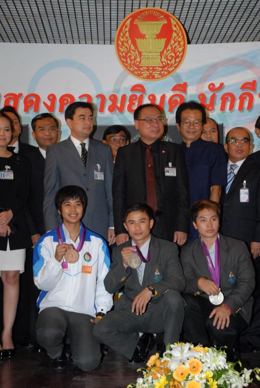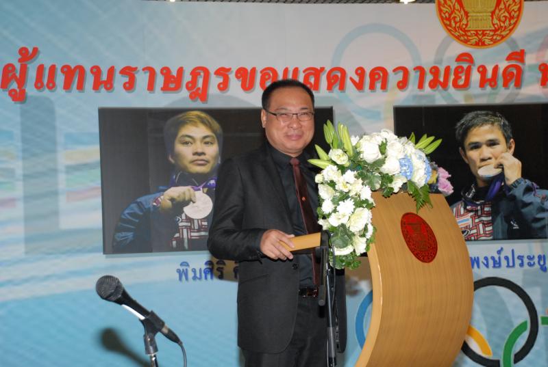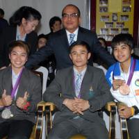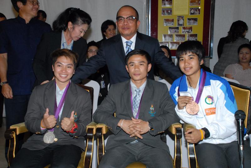 วันพุธที่ ๒๒ สิงหาคม ๒๕๕๕ เวลา ๑๔.๐๐ นาฬิกา ณ บริเวณห้องโถง อาคารรัฐสภา ๑ นายสมศักดิ์ เกียรติสุรนนท์ ประธานรัฐสภา และประธานสภาผู้แทนราษฎร ให้การรับรองและจัดพิธีต้อนรับ พร้อมแสดงความยินดีกับนักกีฬาที่ได้รับเหรียญรางวัลกีฬาโอลิมปิก ครั้งที่ ๓๐ ลอนดอนเกมส์ ๒๐๑๒ ต่อทัพนักกีฬาตัวแทนประเทศไทยที่เข้าร่วมการแข่งขัน นำโดย ร้อยตรี แก้ว พงษ์ประยูร นักกีฬามวยสมัครเล่น เหรียญเงิน น.ส.พิมศิริ ศิริแก้ว นักกีฬายกน้ำหนัก เหรียญเงิน น.ส.ชนาธิป ซ้อนขำ นักกีฬาเทควันโด เหรียญทองแดง โดยประธานรัฐสภาได้มอบเงินรางวัลและของที่ระลึกแก่นักกีฬาที่ได้รับเหรียญ โดยเหรียญเงินคนละ ๔ แสนบาท เหรียญทองแดงคนละ ๒ แสนบาท พร้อมให้ โอวาทต่อนักกีฬาว่า นักกีฬาผู้ได้รับรางวัลล้วนเป็นตัวอย่างให้คนไทยเห็นว่าความพยายามอยู่ที่ไหน ความสำเร็จอยู่ที่นั่น ขณะเดียวกันความสำเร็จที่เกิดขึ้นนี้นับเป็นความสำเร็จของคนไทยทั้งชาติ ทำให้คนทั้งชาติได้ภาคภูมิใจและมีความสุข จึงขอฝากให้เป็นตัวอย่างที่ดีกับวัยรุ่นไทยต่อไป รวมถึงนักกีฬาที่ไม่ได้เหรียญรางวัล ถือว่าสามารถชนะใจคนไทยทุกคนพร้อมขอเป็นกำลังใจสำหรับความสำเร็จที่รออยู่ข้างหน้า ด้าน ร้อยตรี แก้ว พงษ์ประยูร กล่าวขอบคุณประธานรัฐสภาในนามตัวแทนนักกีฬาไทยว่า จะนำโอวาทที่ได้รับไปพัฒนาตนเองเพื่อสร้างชื่อเสียงให้กับประเทศชาติต่อไป