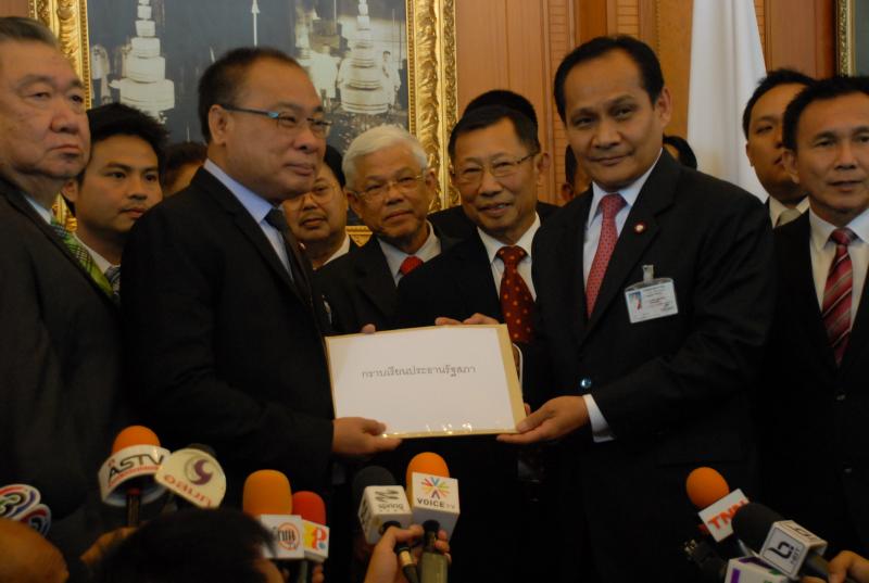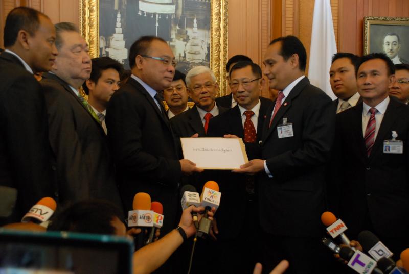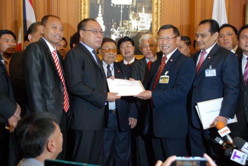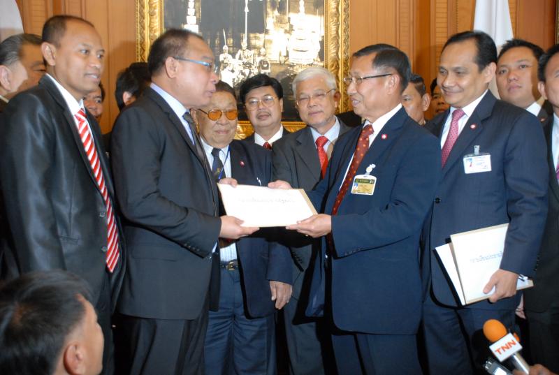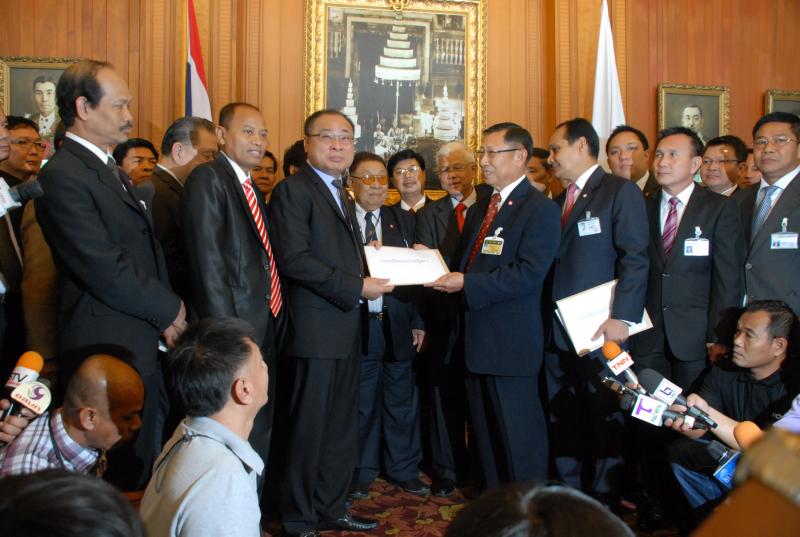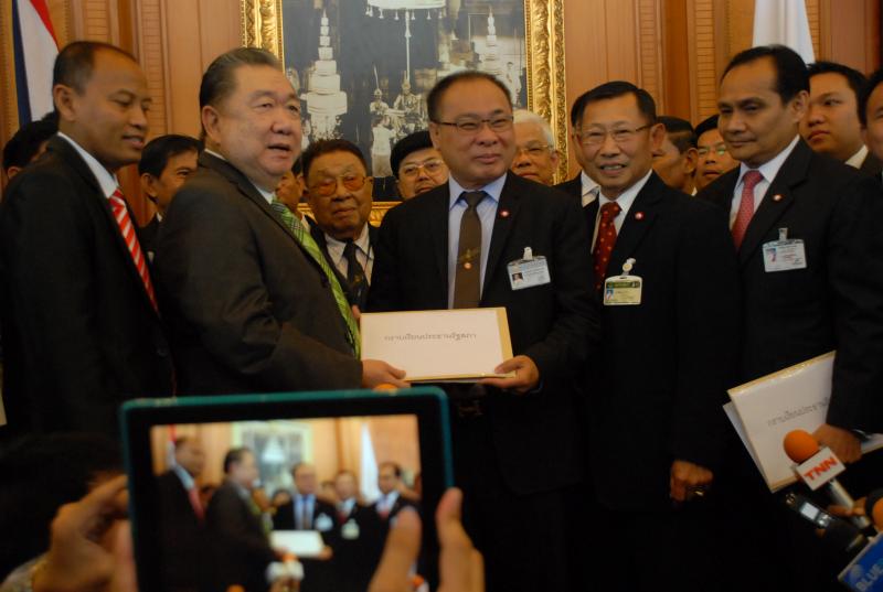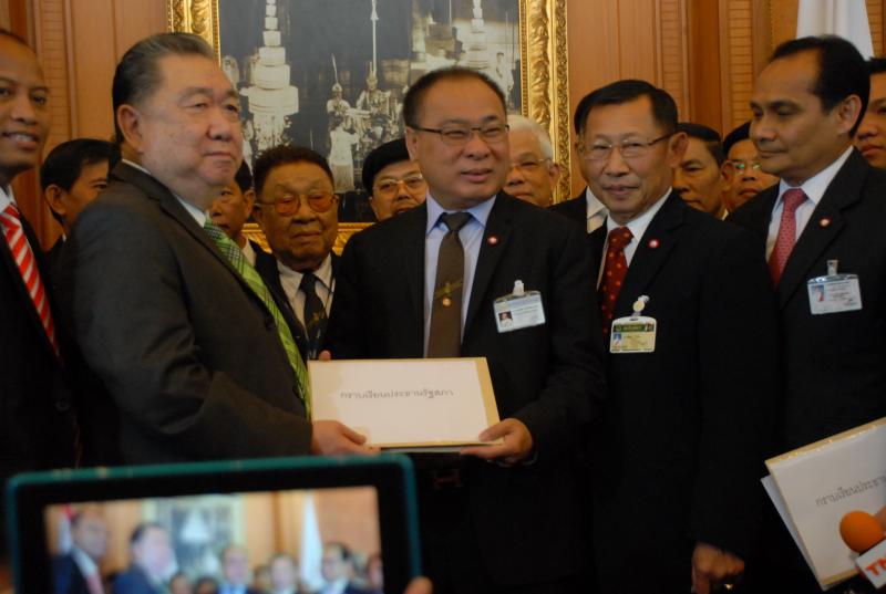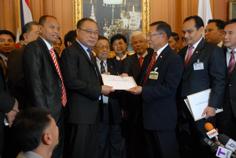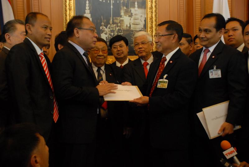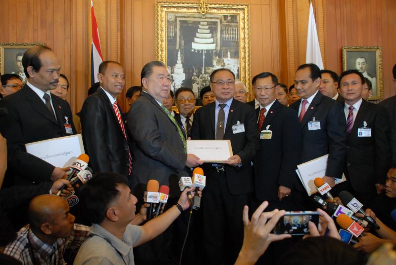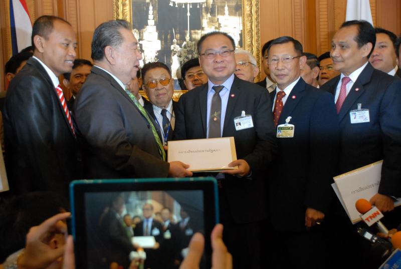 นายสมศักดิ์ เกียรติสุรนนท์ ประธานรัฐสภาและประธานสภาผู้แทนราษฎร รับหนังสือจาก ส.ว. และ ส.ส.พรรครัฐบาล ที่รวบรวมรายชื่อเพื่อขอแก้ไขรัฐธรรมนูญ รวม ๓ เรื่อง