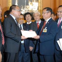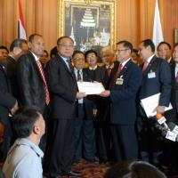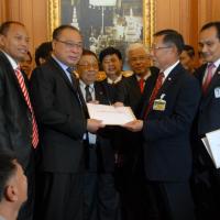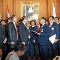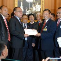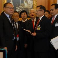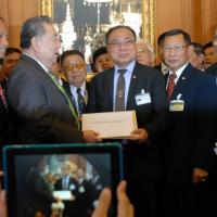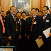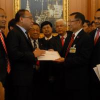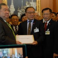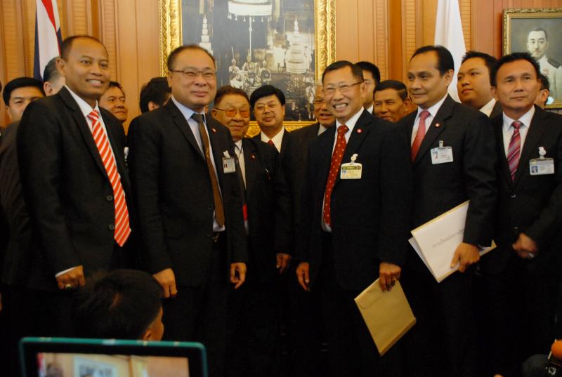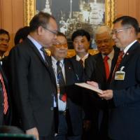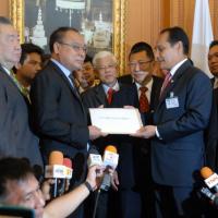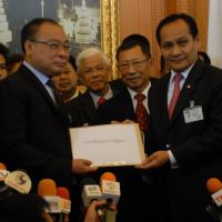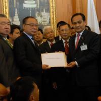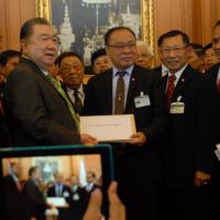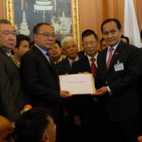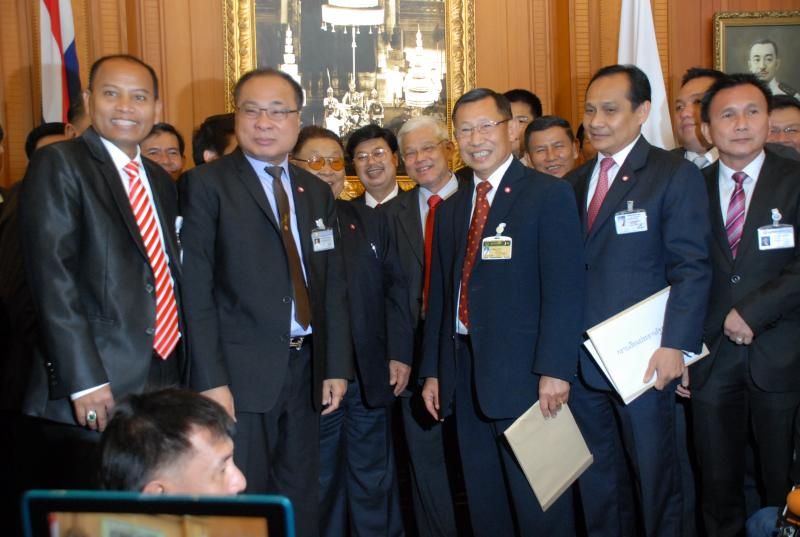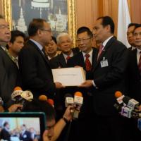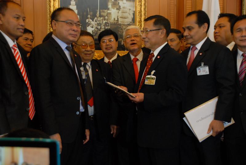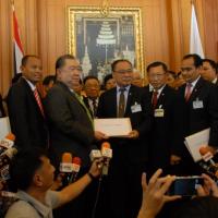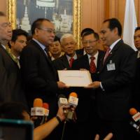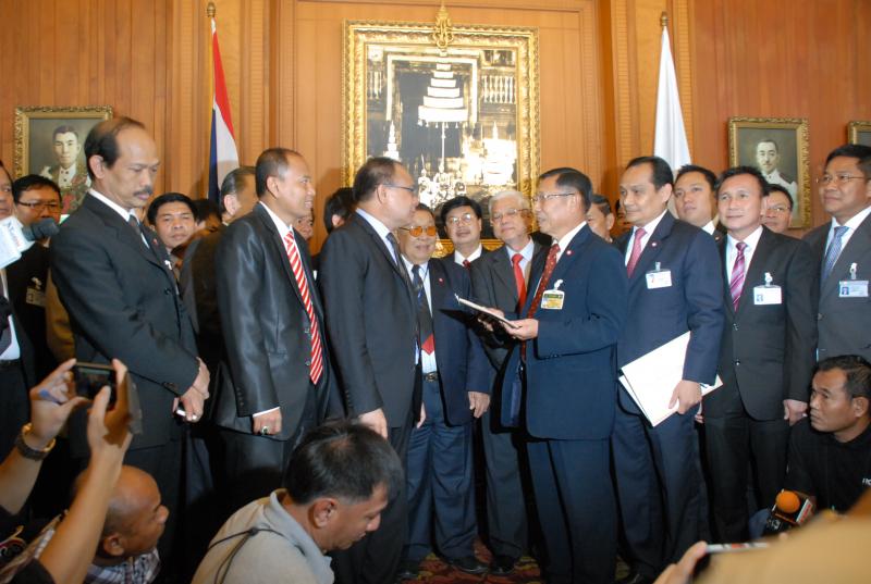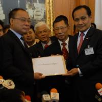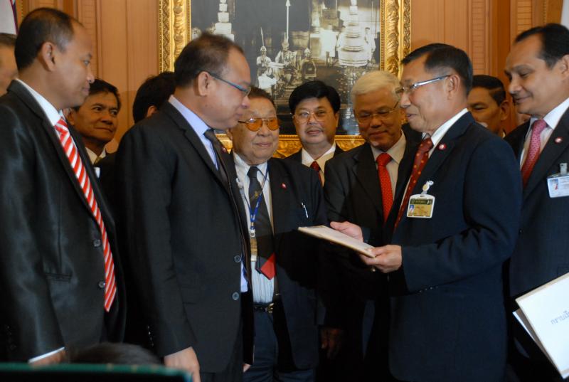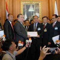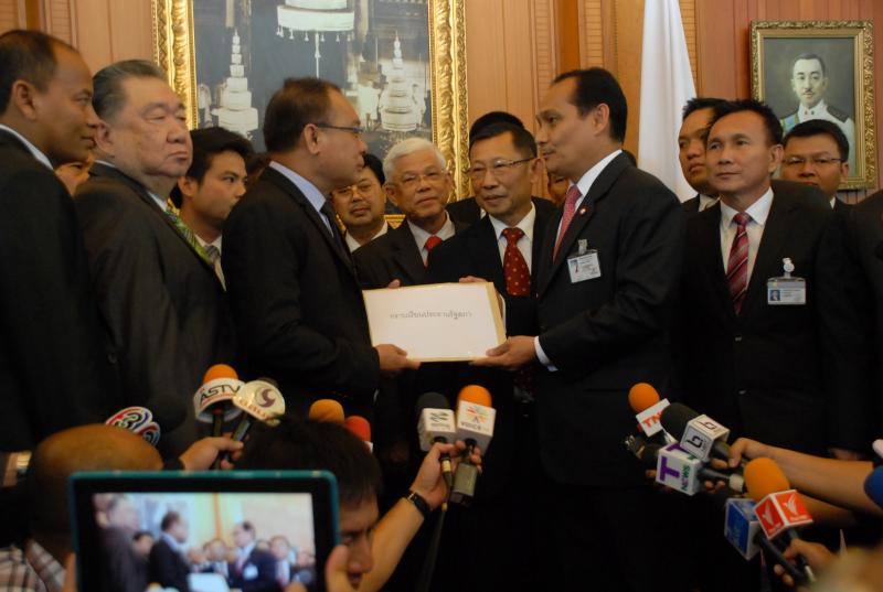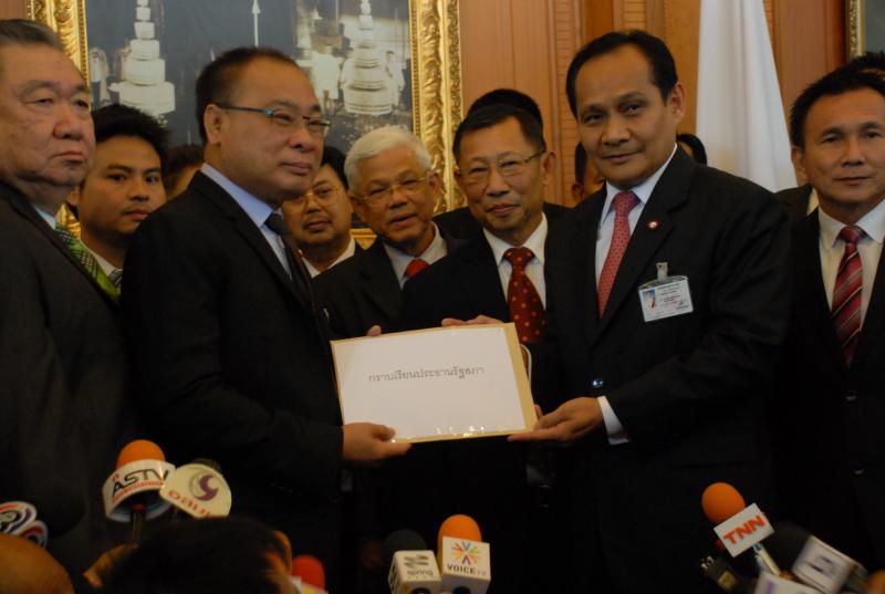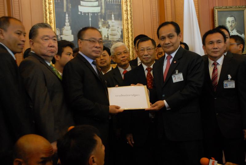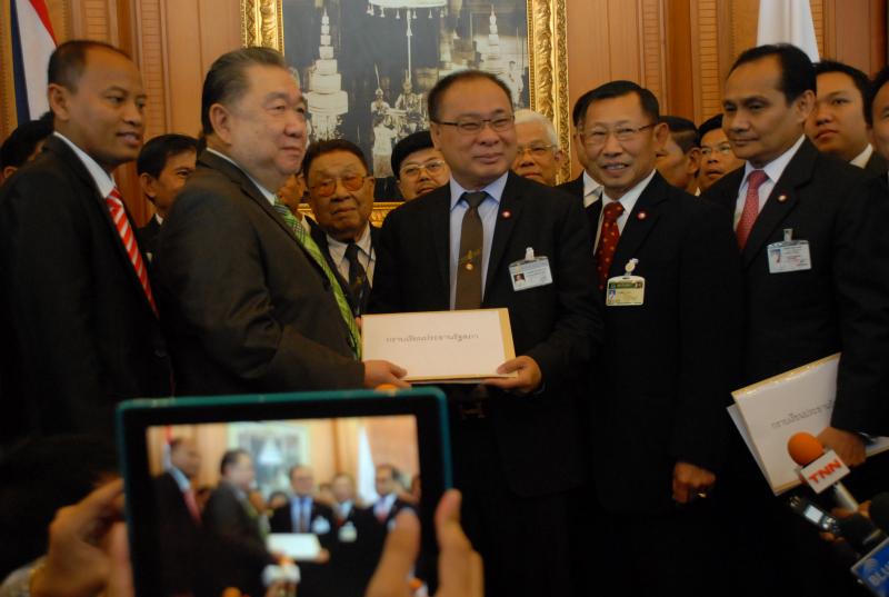 นายสมศักดิ์ เกียรติสุรนนท์ ประธานรัฐสภาและประธานสภาผู้แทนราษฎร รับหนังสือจาก ส.ว. และ ส.ส.พรรครัฐบาล ที่รวบรวมรายชื่อเพื่อขอแก้ไขรัฐธรรมนูญ รวม ๓ เรื่อง