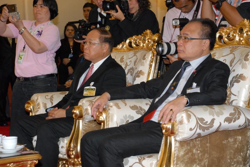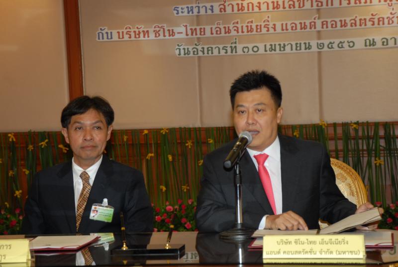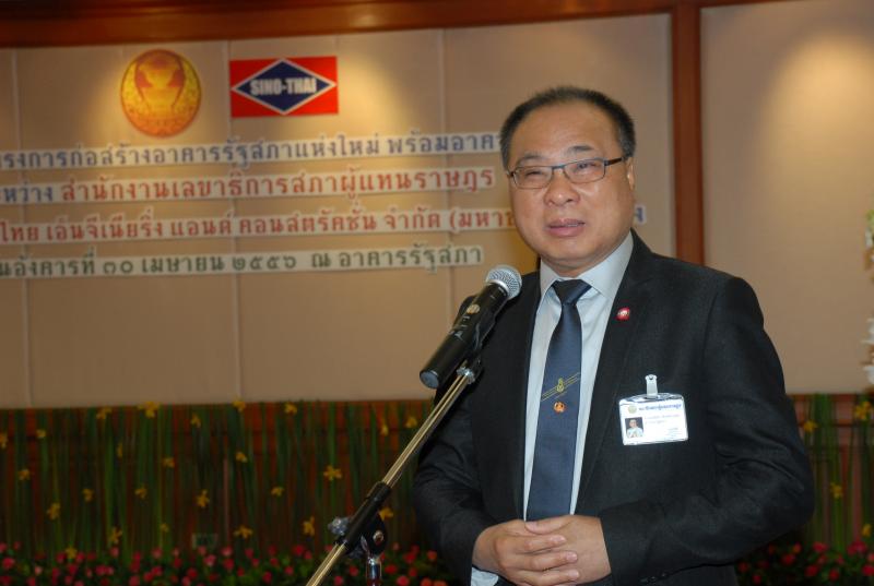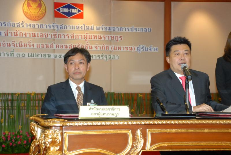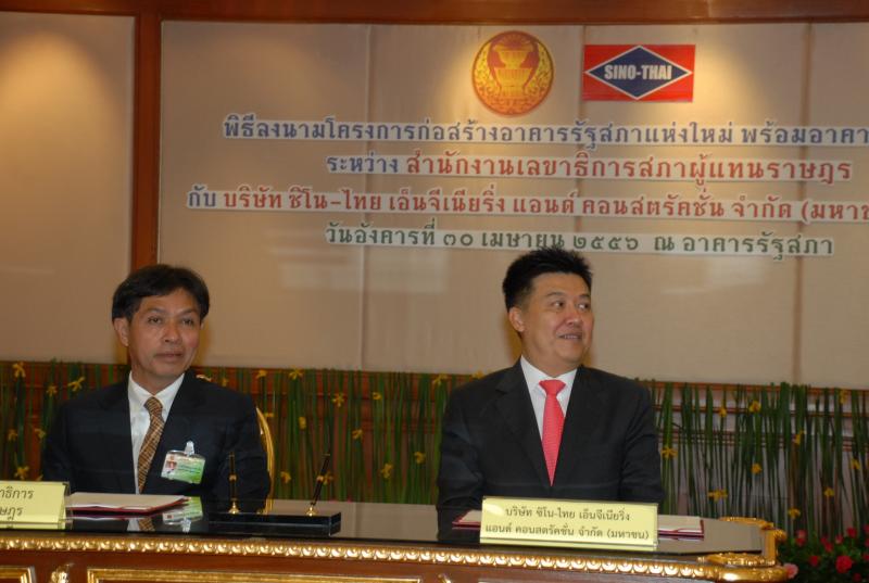 | วันอังคารที่ ๓๐ เมษายน ๒๕๕๖ เวลา ๑๑.๐๐ นาฬิกา ณ ห้องรับรอง ชั้น ๓ อาคารรัฐสภา ๓ นายสมศักดิ์ เกียรติสุรนนท์ ประธานรัฐสภา และนายนิคม ไวยรัชพานิช รองประธานรัฐสภา เป็นประธานในพิธีลงนามโครงการก่อสร้างอาคารรัฐสภาแห่งใหม่พร้อมอาคารประกอบระหว่างสำนักงานเลขาธิการสภาผู้แทนราษฎร โดย นายสุวิจักขณ์ นาควัชระชัย เลขาธิการสภาผู้แทนราษฎร เป็นผู้ลงนาม กับบริษัทซิโน-ไทย เอ็นจิเนียริ่ง แอนด์ คอนสตรัคชั่น จำกัด (มหาชน) โดย นายภาคภูมิ ศรีชำนิ กรรมการผู้จัดการฯ เป็นผู้ลงนาม |