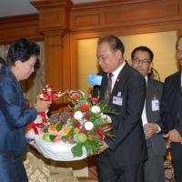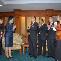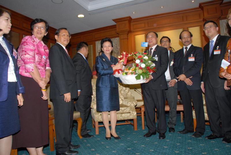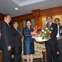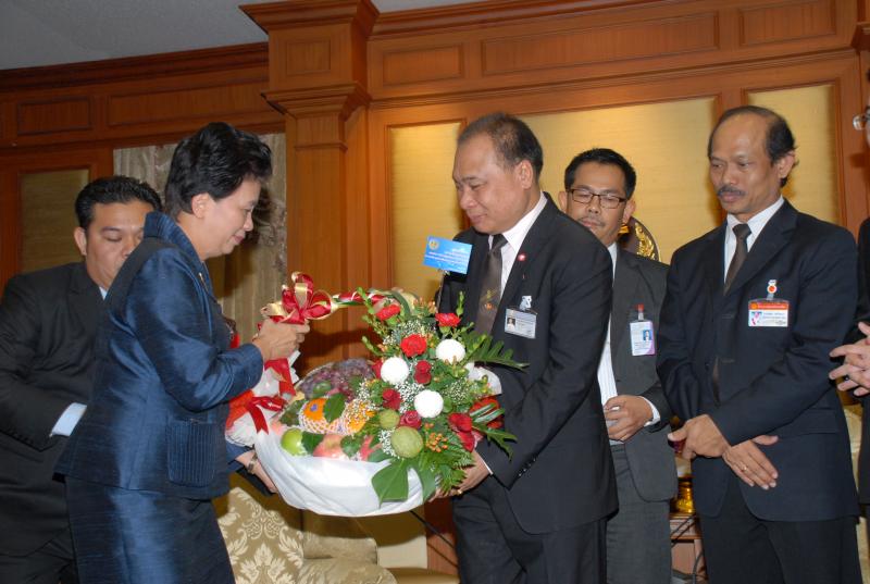 นายสมศักดิ์ เกียรติสุรนนท์ ประธานรัฐสภา และประธานสภาผู้แทนราษฎร รับกระเช้าผลไม้อวยพรวันคล้ายวันเกิดจากนางนรรัตน์ พิมเสน เลขาธิการวุฒิสภา พร้อมด้วยผู้บริหารของสำนักงานเลขาธิการวุฒิสภา