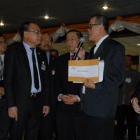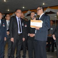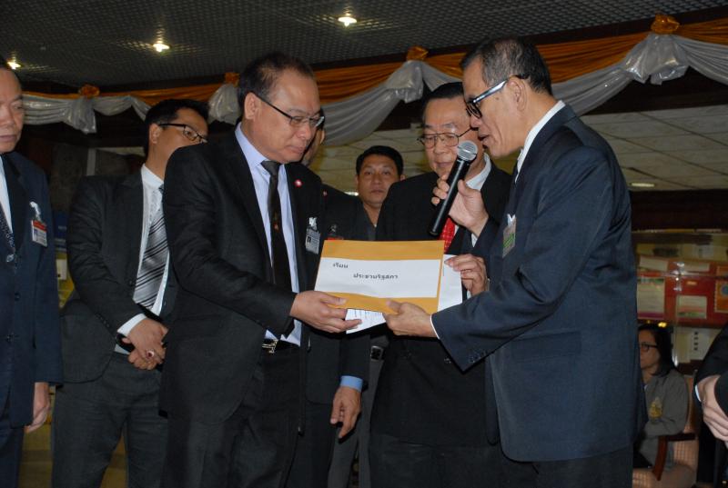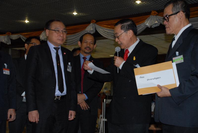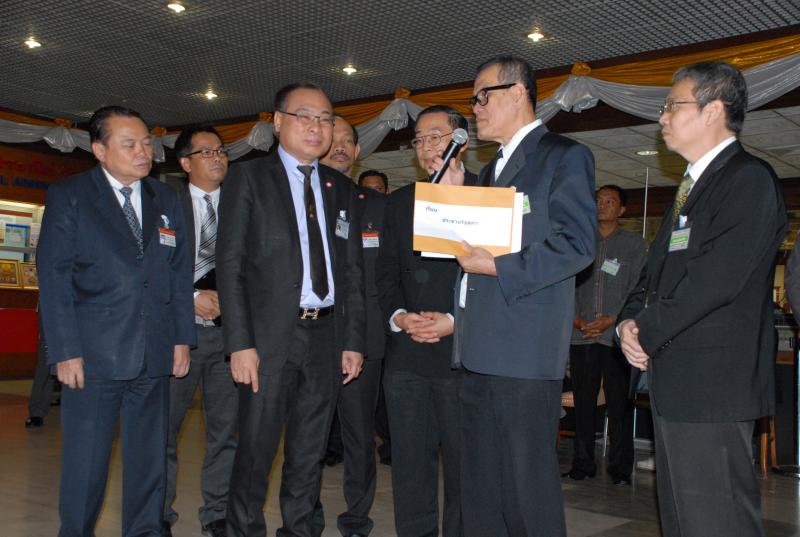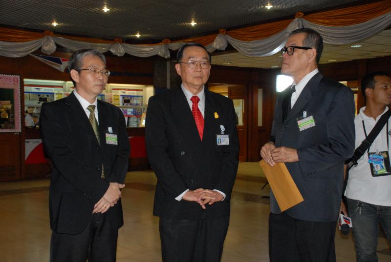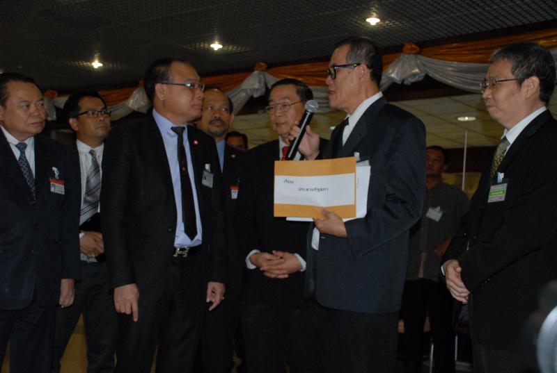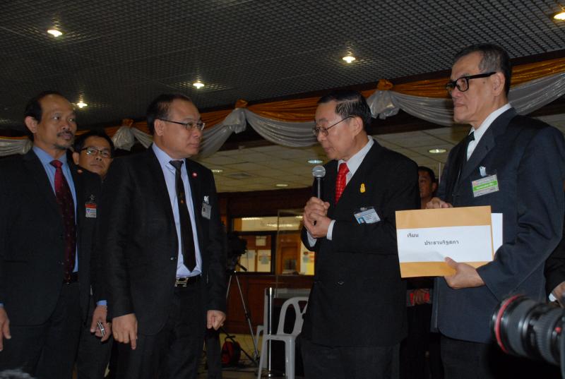 นายสมศักดิ์ เกียรติสุรนนท์ ประธานสภาผู้แทนราษฎรและประธานรัฐสภา รับหนังสือจากนายแพทย์เหวง โตจิราการ ส.ส.บัญชีรายชื่อ พรรคเพื่อไทย และนายอาคม รัตนพจนารถ ตัวแทนกลุ่มประชาชนผู้รักกฎหมาย