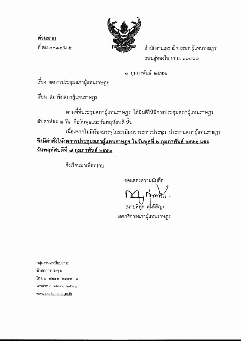 งดการประชุมสภาผู้แทนราษฎร วันพุธที่ ๖ กุมภาพันธ์ ๒๕๕๑ และวันพฤหัสบดีที่ ๗ กุมภาพันธ์ ๒๕๕๑ (เวอร์ชั่นที่ 1) |