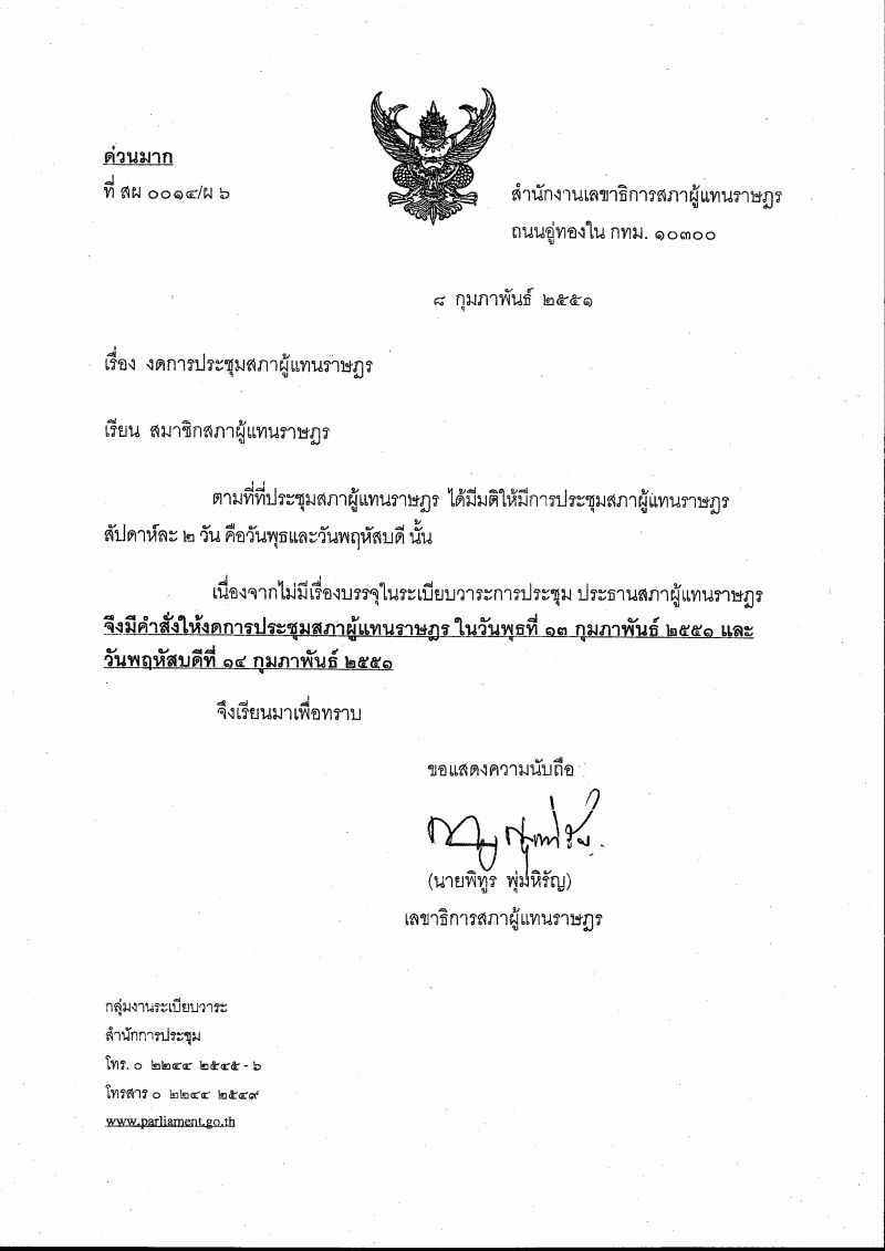 | ชื่อเอกสาร : งดการประชุมสภาผู้แทนราษฎร วันพุธที่ ๑๓ กุมภาพันธ์ ๒๕๕๑ และวันพฤหัสบดีที่ ๑๔ กุมภาพันธ์ ๒๕๕๑ |