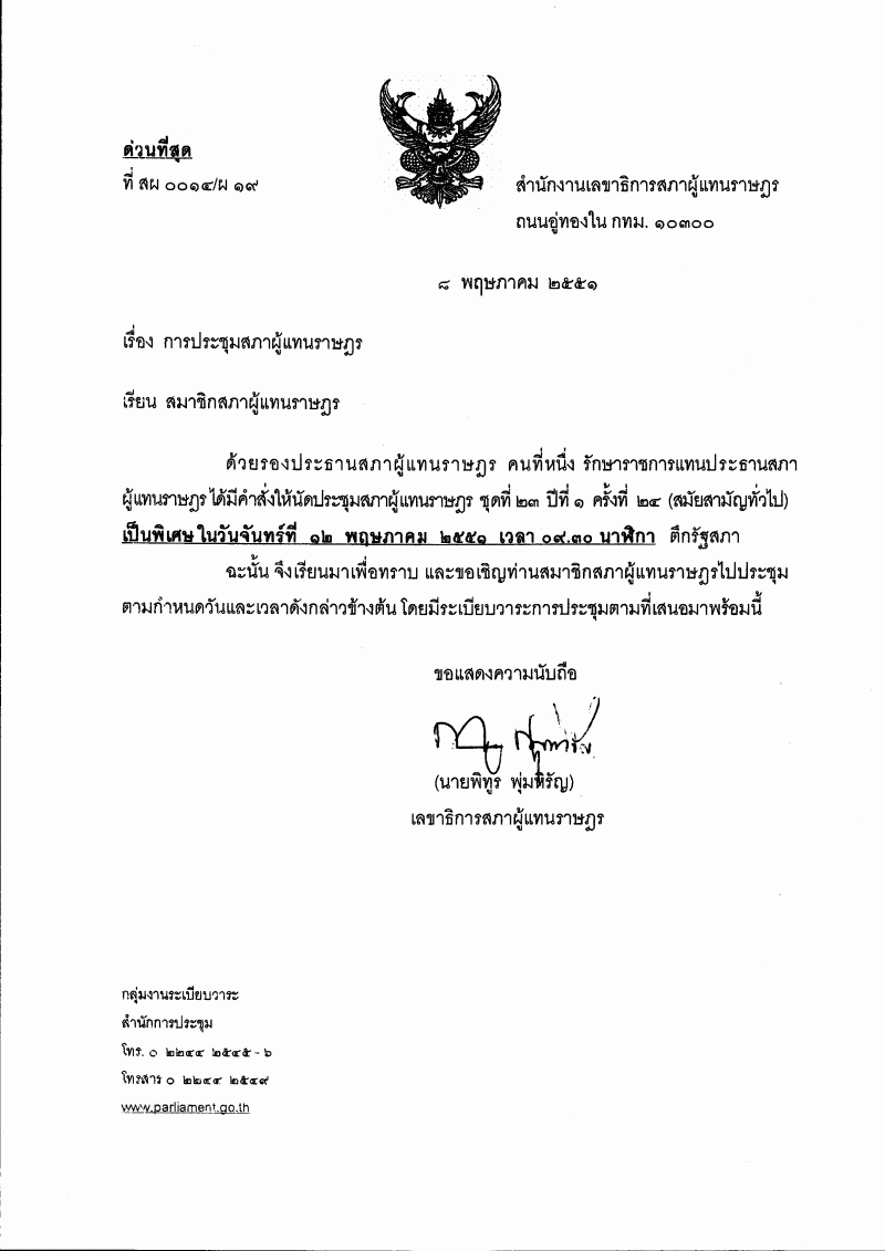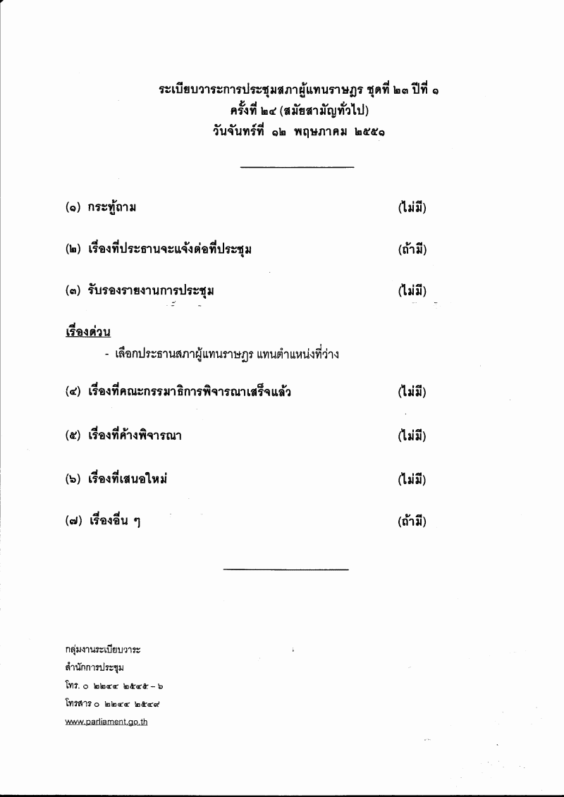 | ชื่อเอกสาร : ระเบียบวาระการประชุมสภาผู้แทนราษฎร ชุดที่ ๒๓ ปีที่ ๑ ครั้งที่ ๒๔ (สมัยสามัญทั่วไป) เป็นพิเศษ วันจันทร์ที่ ๑๒ พฤษภาคม ๒๕๕๑ เวลา ๐๙.๓๐ นาฬิกา ณ ตึกรัฐสภา |