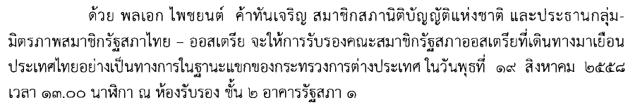 การให้การรับรองคณะสมาชิกรัฐสภาออสเตรีย ในวันพุธที่ ๑๙ สิงหาคม ๒๕๕๘ เวลา ๑๓.๐๐ นาฬิกา ณ ห้องรับรอง ชั้น ๒ อาคารรัฐสภา ๑