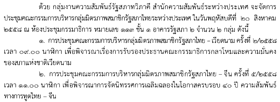 การประชุมคณะกรรมการบริหารกลุ่มมิตรภาพสมาชิกรัฐสภาไทยระหว่างประเทศ ในวันพฤหัสบดีที่ ๒๐ สิงหาคม ๒๕๕๘ ณ ห้องประชุมกรรมาธิการ หมายเลข ๑๑๓ ชั้น ๑ อาคารรัฐสภา ๒