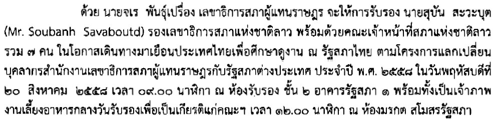 การให้การรับรองบุคคลสำคัญชาวต่างประเทศ ในวันพฤหัสบดีที่ ๒๐ สิงหาคม ๒๕๕๘ เวลา ๙.๐๐ นาฬิกา ณ ห้องรับรอง ชั้น ๒ อาคารรัฐสภา ๑
