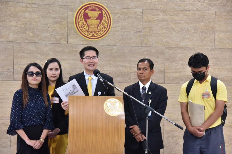เกียกกาย นายมงคลกิตติ์ สุขสินธารานนท์ หัวหน้าพรรคไทยศรีวิไลย์ รับหนังสือจากกลุ่มผู้สอบ