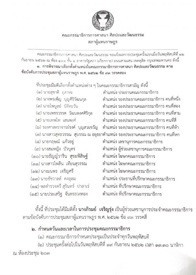 เพื่อพิจารณาเลือกตำแหน่งต่าง ๆ ในคณะกรรมาธิการตามข้อบังคับการประชุมสภาผู้แทนราษฎร