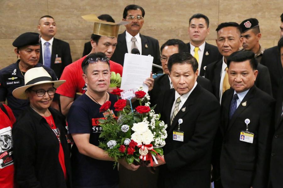 พล.ต.อ.เสรีพิศุทธ์ เตมียเวส สมาชิกสภาผู้แทนราษฎรพรรคเสรีรวมไทย รับมอบดอกไม้เพื่อเป็นกำลังใจ ในการทำหน้าที่ฝ่ายค้านจากตัวแทนกลุ่มประชาชนรณรงค์ให้แก้ไขรัฐธรรมนูญ