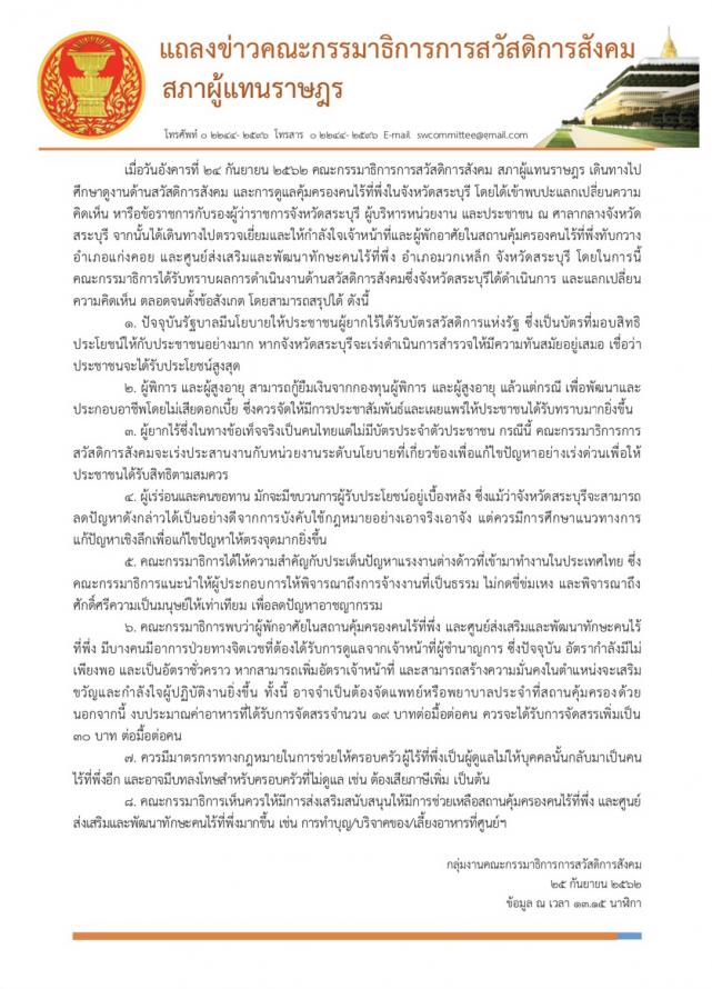 แถลงข่าวถึงการเดินทางไปศึกษาดูงานด้านสวัสดิการสังคม และการคุ้มครอง
