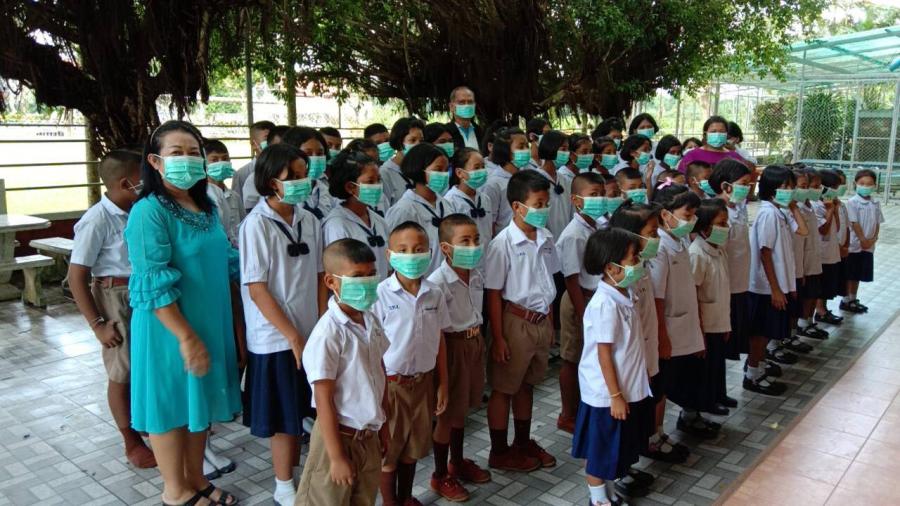 เด็กนักเรียนในพื้นที่อำเภอเมืองตรัง จังหวัดตรัง เพื่อป้องกันหมอกควันที่เป็นวิกฤติอยู่ในภาคใต้ขณะนี้