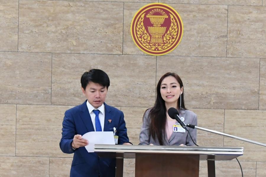 นางสาวภาดาท์ วรกานนท์ และนายสมเกียรติ ถนอมสินธุ์ โฆษคณะกรรมาธิการการสื่อสารโทรคมนาคม และดิจิทัลเพื่อเศรษฐกิจและสังคม สภาผู้แทนราษฎร แถลงข่าว