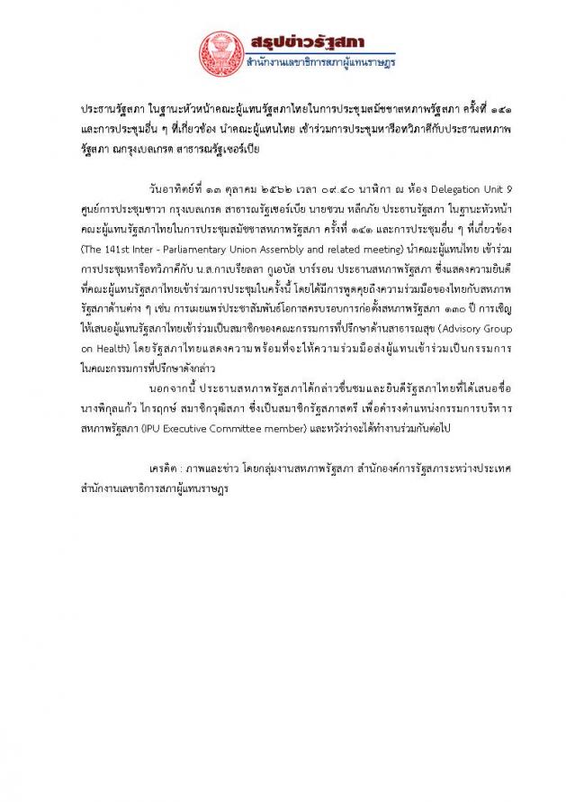 ประธานรัฐสภา ในฐานะหัวหน้าคณะผู้แทนรัฐสภาไทยในการประชุมสมัชชาสหภาพรัฐสภา ครั้งที่ ๑๔๑ นำคณะผู้แทนไทยเข้าร่วมการประชุมหารือทวิภาคีกับ ประธานสหภาพรัฐสภา