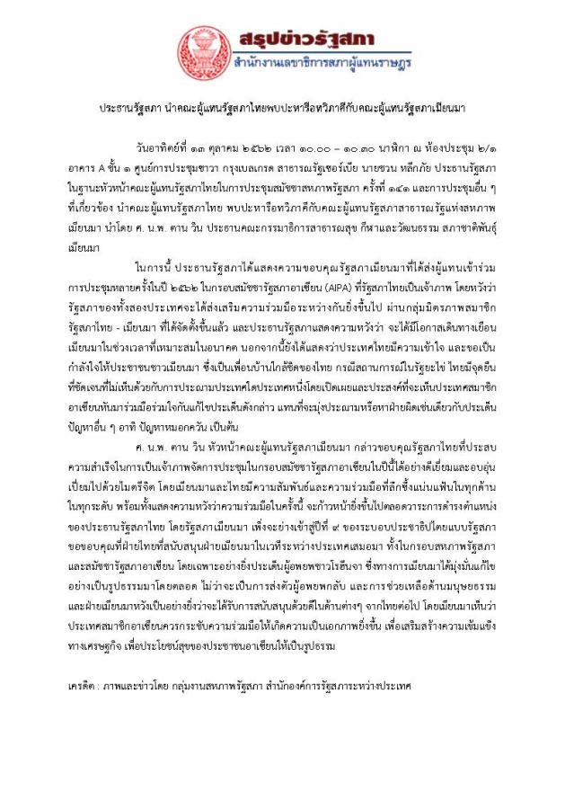 ประธานรัฐสภา ในฐานะหัวหน้าคณะผู้แทนรัฐสภาไทยในการประชุมสมัชชาสหภาพรัฐสภา ครั้งที่ ๑๔๑ นำคณะผู้แทนรัฐสภาไทย พบปะหารือทวิภาคีกับคณะผู้แทนรัฐสภาสาธารณรัฐแห่งสหภาพเมียนมา