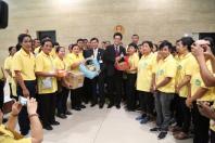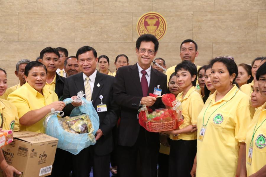 นายประกอบ รัตนพันธ์ สมาชิกสภาผู้แทนราษฎร จังหวัดนครศรีธรรมราช พรรคประชาธิปัตย์ และ นายแพทย์สุกิจ อัถโถปกรณ์ ที่ปรึกษาประธานสภาผู้แทนราษฎร รับมอบกระเช้าผลไม้