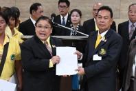 เกียกกาย นายสุรทิน พิจารณ์ หัวหน้าพรรคประชาธิปไตยใหม่ รับหนังสือจากน.ส.ณัฐชลัยย์