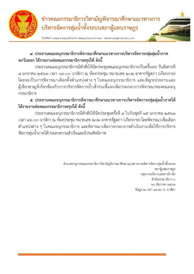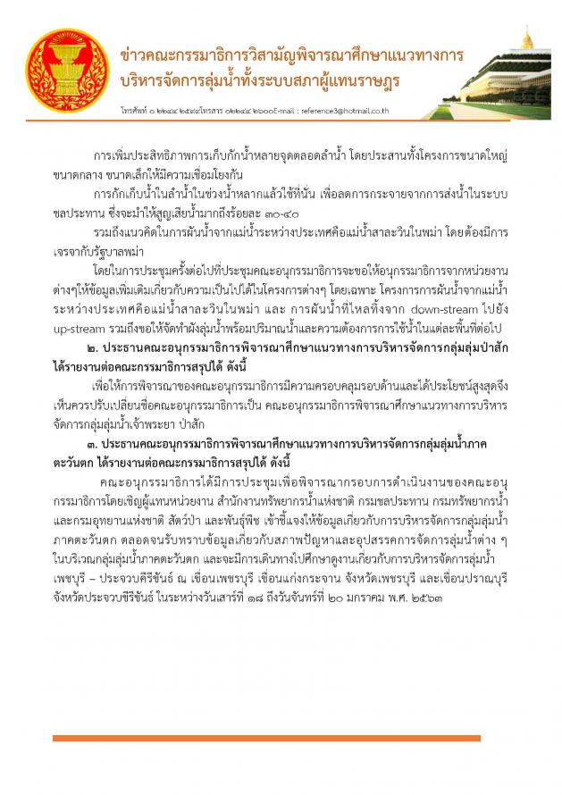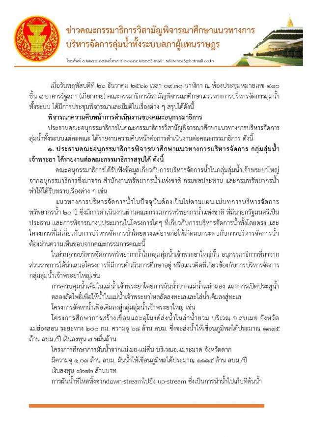 โฆษกคณะกรรมาธิการวิสามัญพิจารณาศึกษาแนวทางการบริหารจัดการลุ่มน้ำทั้งระบบ และคณะ แถลงผลการประชุมพิจารณาความคืบหน้าการดำเนินงานของคณะอนุ กมธ.