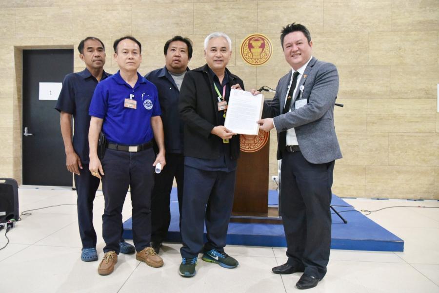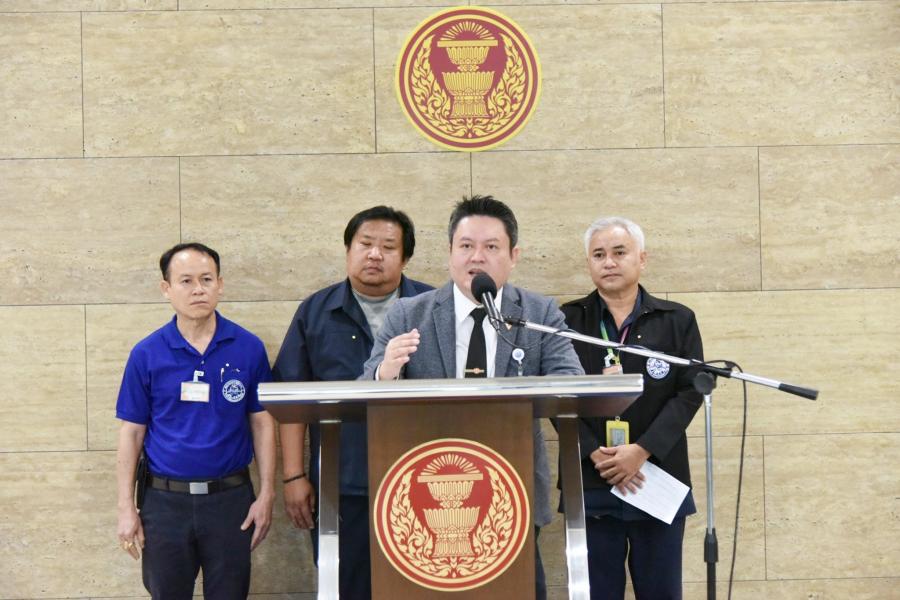 คนที่สาม รับยื่นหนังสือจากนายบัณฑิต พรึงลำภู เลขานุการสหภาพการทางพิเศษ