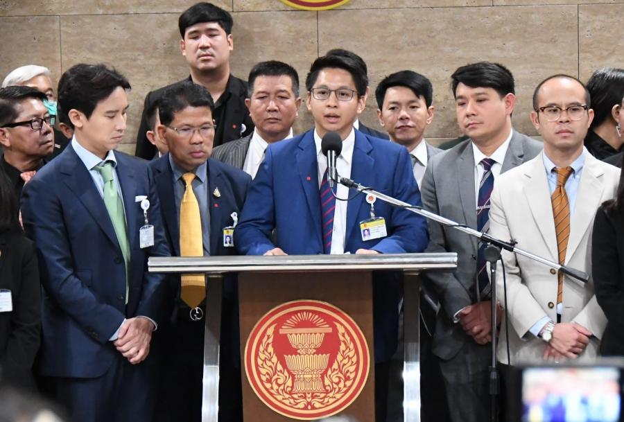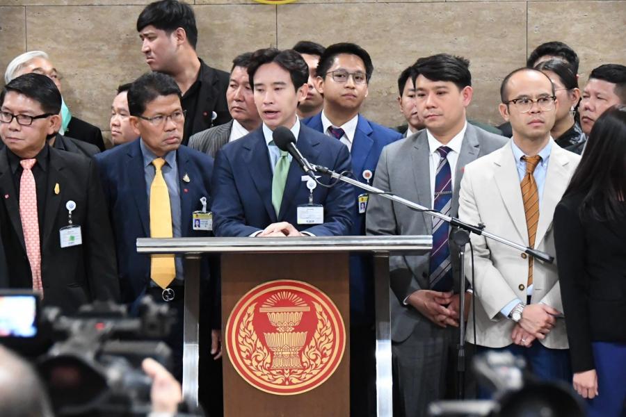 นายพิธา ลิ้มเจริญรัตน์ ส.ส. อดีตพรรคอนาคตใหม่ และคณะ แถลงข่าวถึงสาเหตุในการเดินออก