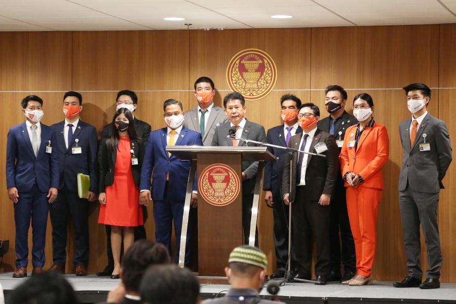 นายณัฐชา บุญไชยอินสวัสดิ์ และนายธีรัจชัย พันธุมาศ ส.ส.พรรคก้าวไกล พร้อมคณะ ร่วมกันแถลงข่าว