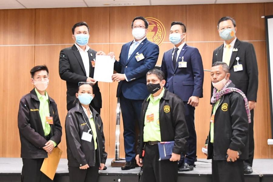 นายจิรายุ ห่วงทรัพย์ ส.ส. พรรคเพื่อไทย ในฐานะตัวแทนพรรคร่วมฝ่ายค้าน รับยื่นหนังสือจากนายวรพล แกมขุนทด นายกสมาคมวิชาชีพผู้ขับขี่รถยนต์สาธารณะ (รถแท็กซี่)