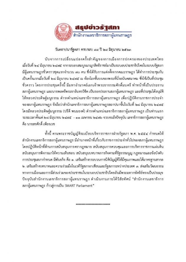 ประธานรัฐสภา เป็นประธานในพิธีสงฆ์ เนื่องในวันสถาปนารัฐสภา ครบรอบ ๘๘ ปี