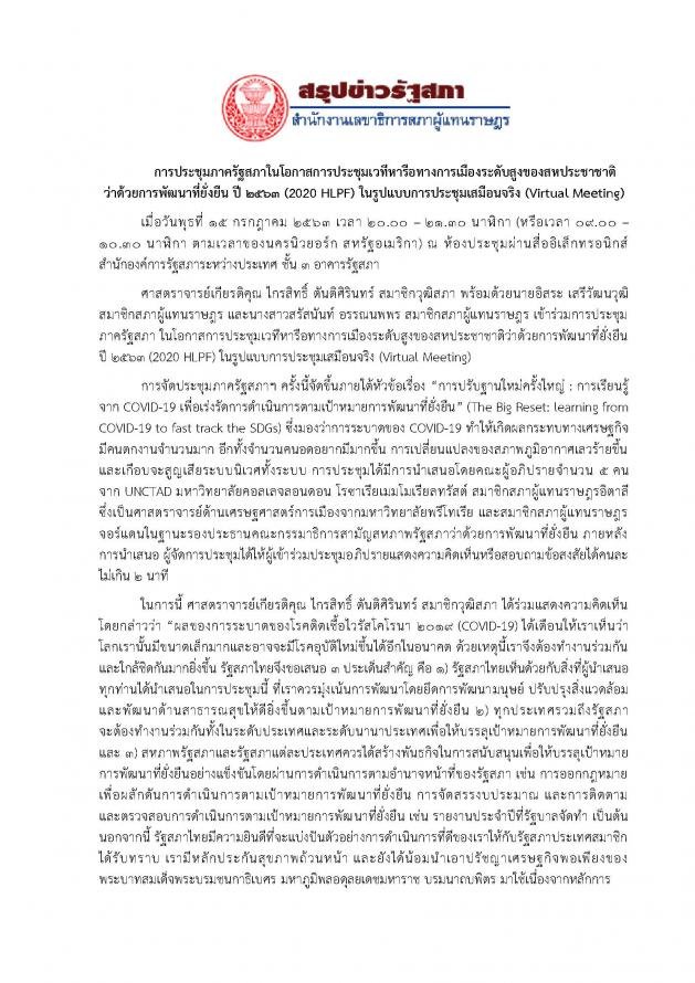 HLPF) หัวข้อ “การปรับฐานใหม่ครั้งใหญ่ : การเรียนรู้จากโควิด-๑๙” เพื่อเร่งรัดการดำเนินการ