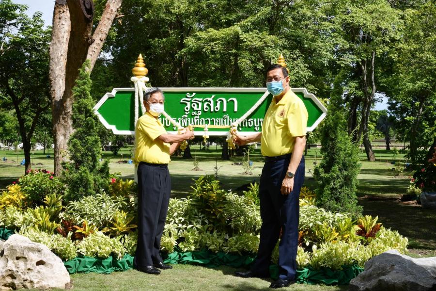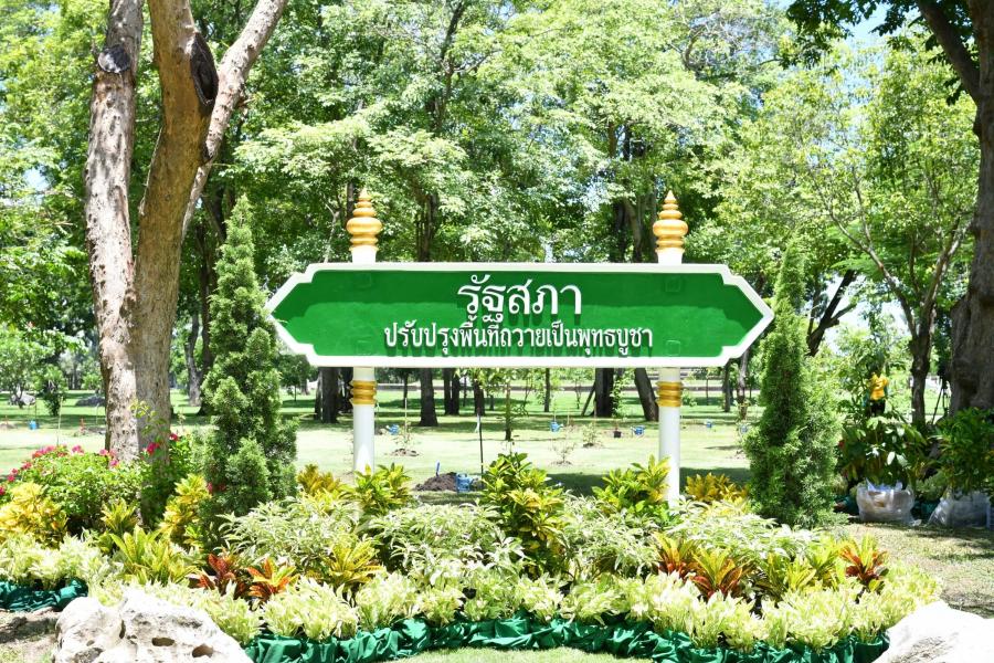 จากนั้น นายชวน หลีกภัย ประธานรัฐสภาและประธานสภาผู้แทนราษฎร และ ศาสตราจารย์พิเศษพรเพชร วิชิตชลชัย ประธานวุฒิสภาและรองประธาน รัฐสภา ทำพิธีเปิดป้ายปูน รัฐสภา และสนับสนุนค่าบำรุงดูแลรักษา พื้นที่ ต้นไม้ และการติดตั้งป้ายไว้เป็นอนุสรณ์ถวายเป็นพุทธบูชา โดยมี นายจีรวิชญ์ นิยมธรรม รองผู้อำนวยการปฏิบัติหน้าที่แทน ผู้อำนวยการสำนักงานพระพุทธศาสนาแห่งชาติ รับมอบ