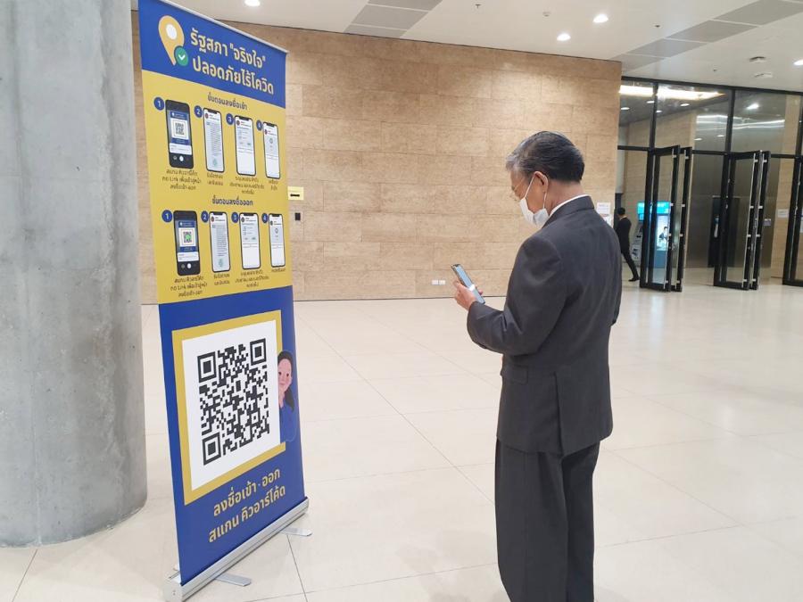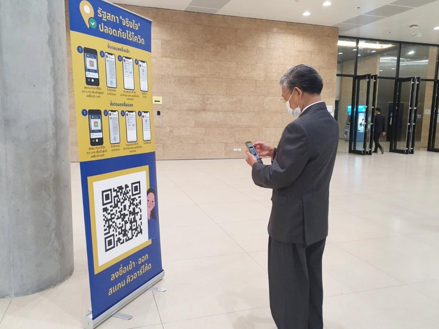 ก่อนเข้าอาคารรัฐสภาผ่านแอปพลิเคชัน "จริงใจ"  ซึ่งเป็นแอปพลิเคชันที่ใช้บันทึกประวัติ