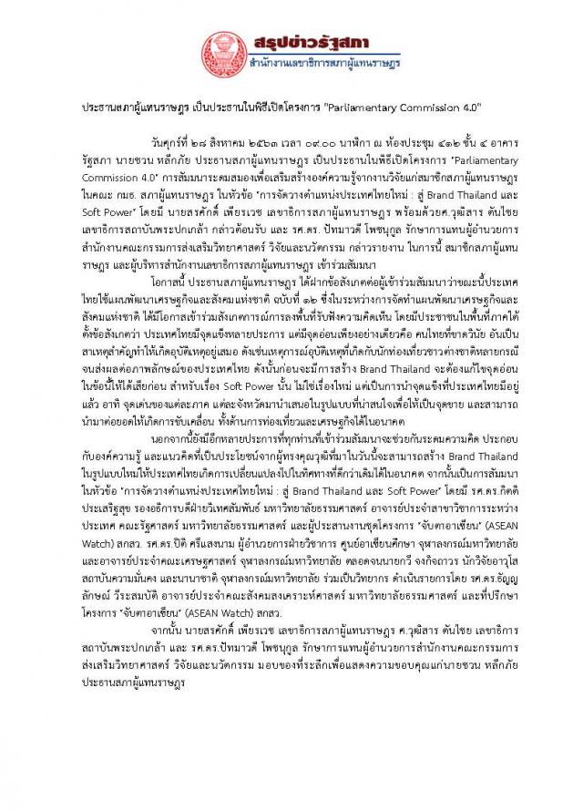 ประธานสภาผู้แทนราษฎร เป็นประธานในพิธีเปิดโครงการ "Parliamentary Commission 4.0"