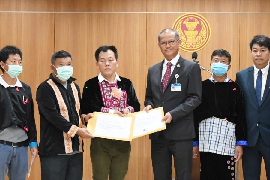 นายสมบูรณ์ อุทัยเวียนกุล เลขานุการประธานสภาผู้แทนราษฎร รับยื่นหนังสือจากนายวิชิต เมธาอนันต์กุล ตัวแทนกลุ่มผู้เดือดร้อนชาวไทย ภูเขาม่อนแจ่ม อ.แม่ริม จ.เชียงใหม่