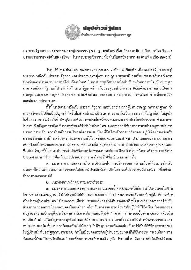 ประธานรัฐสภา และประธานสภาผู้แทนราษฎร ปาฐกถาพิเศษเรื่อง "ธรรมาภิบาลกับการป้องกันและปราบปรามการทุจริตในสังคมไทย" ในการประชุมวิชาการเนื่องในวันสหวิทยาการ ณ อิมแพ็ค เมืองทองธานี