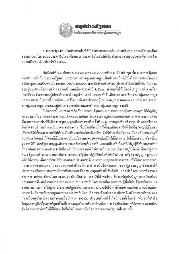 ประธานรัฐสภา เป็นประธานในพิธีเปิดโครงการส่งเสริมและสนับสนุนความเป็นพลเมืองของเยาวชนในระบอบประชาธิปไตยเพื่อพัฒนาประชาธิปไตยให้ยั่งยืน กิจกรรมรวมรุ่นยุวชนเพื่อการสร้างความเป็นพลเมืองประจำปี ๒๕๖๓