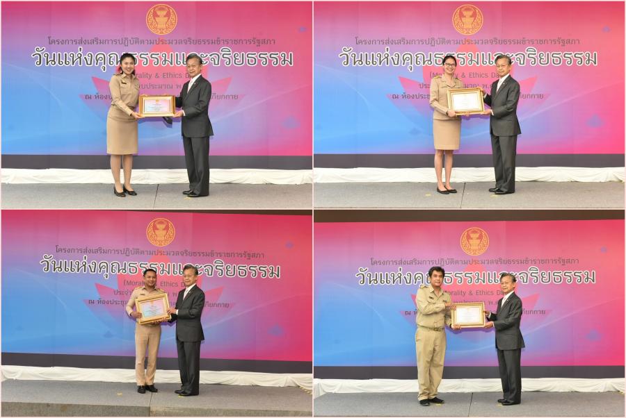 จากนั้น ในเวลา ๑๔.๐๐ นาฬิกา นายชวน หลีกภัย ประธานรัฐสภา มอบเข็มเชิดชูเกียรติ โล่ยกย่องประกาศเกียรติคุณและเกียรติบัตรให้แก่ผู้มีคุณธรรมและจริยธรรมดีเด่น ในสังกัดรัฐสภา จำนวน ๘ คน ประกอบด้วย ๑. ประเภทวิชาการ ได้แก่ นางสุวรรณา มารีนี นักประชาสัมพันธ์ ชำนาญการพิเศษ สำนักประชาสัมพันธ์ สำนักงานเลขาธิการสภาผู้แทนราษฎร และนางดวงหทัย แก้วสกุล วิทยากรชำนาญการ สำนักประชาสัมพันธ์ สำนักงานเลขาธิการวุฒิสภา ๒. ประเภททั่วไป ได้แก่ นายกันตพงศ์ ลายทิพย์ เจ้าพนักงานเครื่องคอมพิวเตอร์ชำนาญงาน สำนักสารสนเทศ สำนักงานเลขาธิการสภาผู้แทนราษฎร และนายอดิศร สุวรรณผ่องใส เจ้าพนักงานโสตทัศนศึกษาชำนาญงาน สำนักประชาสัมพันธ์ สำนักงานเลขาธิการวุฒิสภา