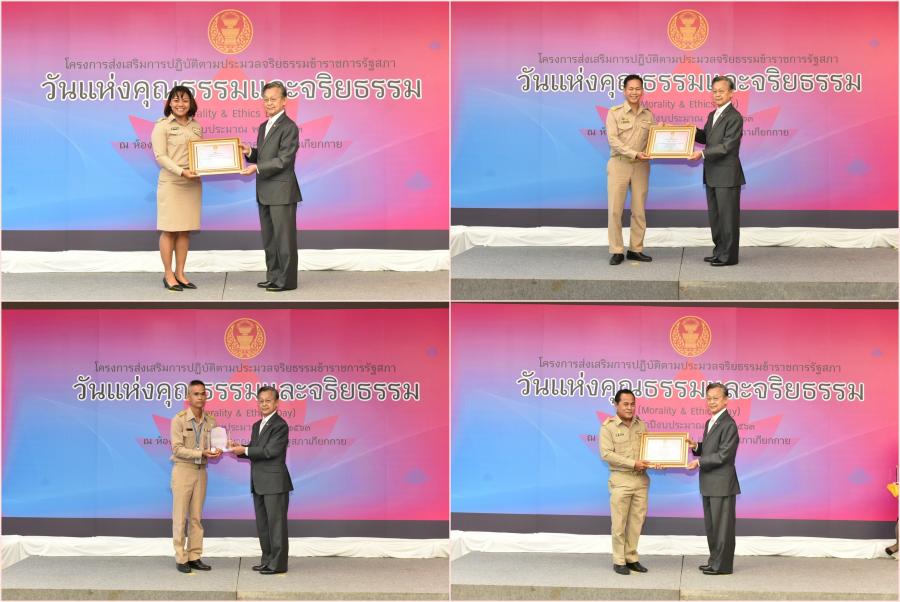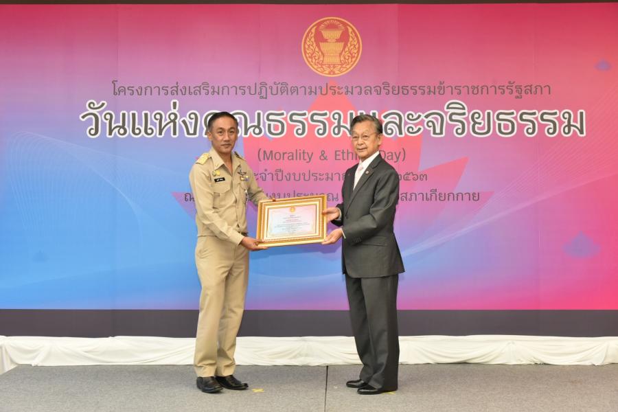พร้อมมอบโล่ยกย่องประกาศเกียรติคุณและเกียรติบัตรให้แก่สำนักที่มีผลงาน ด้านการส่งเสริมตามประมวลจริยธรรมข้าราชการรัฐสภา และความโปร่งใสของ ส่วนราชการสังกัดรัฐสภา จำนวน ๖ สำนัก ประกอบด้วย ๑. รางวัลระดับ "ดีเด่น" ได้แก่ สำนักงานเลขานุการ ก.ร. สำนักงานเลขาธิการ