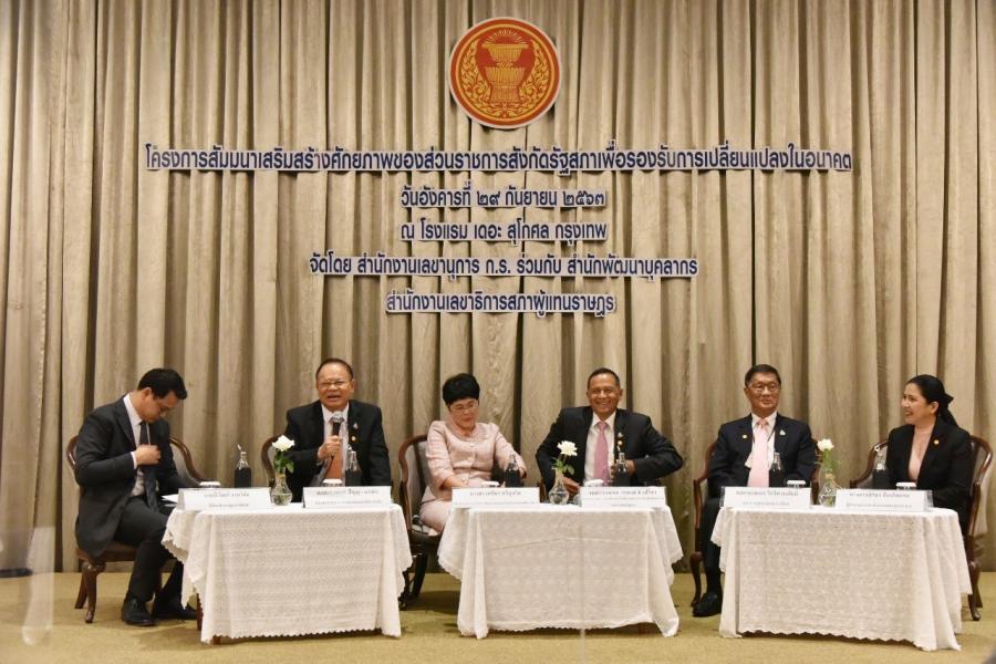 วันอังคารที่ ๒๙ กันยายน ๒๕๖๓ เวลา ๐๙.๐๐ นาฬิกา ณ ห้องกมลทิพย์ ๒ - ๓ ชั้น ๒ โรงแรมเดอะ สุโกศล กรุงเทพฯ นายชวน หลีกภัย ประธานรัฐสภา เป็นประธานในพิธีเปิด โครงการสัมมนาเสริมสร้างศักยภาพของส่วนราชการสังกัดรัฐสภา เพื่อรองรับการเปลี่ยนแปลง ในอนาคต โดยมี นายสรศักดิ์ เพียรเวช เลขาธิการสภาผู้แทนราษฎร ในฐานะเลขานุการ ก.ร. กล่าวรายงาน ในการนี้ คณะทำงานประธานสภาผู้แทนราษฎร คณะกรรมการข้าราชการฝ่ายรัฐสภา และคณะผู้บริหารสำนักงานเลขาธิการสภาผู้แทนราษฎร สำนักงานเลขาธิการวุฒิสภา และ ข้าราชการของทั้งสองสำนักงานฯ ร่วมพิธี สำหรับโครงการดังกล่าว มีวัตถุประสงค์เพื่อรับฟังความคิดเห็นปัญหาความต้องการและ ข้อเสนอแนะจาก ก.ร. และผู้ทรงคุณวุฒิในการดำเนินการพัฒนาศักยภาพของส่วนราชการ สังกัดรัฐสภาเพื่อรองรับการเปลี่ยนแปลงของรัฐสภาที่จะเกิดขึ้นในอนาคต อีกทั้งเพื่อนำข้อคิดเห็น ข้อเสนอแนะจากการสัมมนามาเป็นข้อมูลให้หน่วยงานที่เกี่ยวข้องประกอบการศึกษา วิเคราะห์ เป็นแนวทางปฏิบัติตามยุทธศาสตร์ของแต่ละส่วนราชการสังกัดรัฐสภา รวมทั้งยุทธศาสตร์ การบริหารทรัพยากรบุคคลของส่วนราชการสังกัดรัฐสภา จากนั้นในเวลา ๑๐.๓๐ นาฬิกา เป็นการอภิปรายเรื่อง ประธาน อ.ก.ร. พบผู้บริหารของ ส่วนราชการสังกัดรัฐสภา โดยมีผู้ร่วมอภิปราย คือ พล.ต.อ.ปัญญา มาเม่น ประธาน อ.ก.ร. ระบบงาน และอัตรากำลัง พล.ต.อ.วรพงษ์ ชิวปรีชา ประธาน อ.ก.ร. ประเมินประสิทธิภาพและประสิทธิผล ของงานราชการของรัฐสภา น.ส.ศศิธร ศรีสุจริต ประธาน อ.ก.ร. สรรหา พัฒนา และส่งเสริมสมรรถภาพ ข้าราชการ และ พล.อ.อ.วีรวิท คงศักดิ์ อ.ก.ร. กฎหมายและกฎระเบียบ ดำเนินรายการ โดย น.ส.สิริธร ลิมปพยอม ผู้อำนวยการสำนักงานเลขานุการ ก.ร. และนายนิวัฒน์ งามวิลัย นิติกรชำนาญการพิเศษ