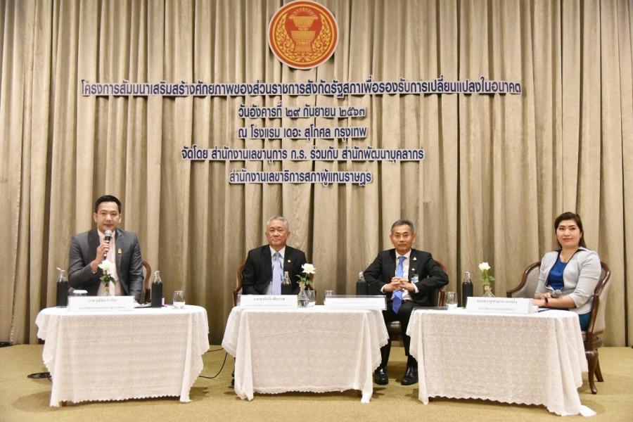 | วันอังคารที่ ๒๙ กันยายน ๒๕๖๓ เวลา ๑๓.๐๐ นาฬิกา ณ ห้องกมลทิพย์ ๒ - ๓ ชั้น ๒ โรงแรม เดอะ สุโกศล กรุงเทพฯ ซึ่งเป็นภาคบ่ายของการสัมมนาเสริมสร้าง ศักยภาพของส่วนราชการสังกัดรัฐสภา เพื่อรองรับการเปลี่ยนแปลงในอนาคตเป็น การอภิปราย เรื่อง การพัฒนาประสิทธิภาพการบริหารทรัพยากรบุคคลในอนาคต โดย น.ส.ศศิเพ็ญรัตน์ พลสนะ นายชาญวิทย์ ไกรฤกษ์ และนายสุรพงษ์ มาลี ผู้ทรงคุณวุฒิ จากคณะอนุกรรมการจัดทำแผนปฏิบัติการตามยุทธศาสตร์การบริหาร ทรัพยากรบุคคลของส่วนราชการสังกัดรัฐสภา ดำเนินรายการ โดย นายเกียรติคุณ กอณีนัย ผู้บังคับบัญชากลุ่มงานนโยบาย และเลขานุการ ก.ร. และ น.ส.ทศพาณี ทศิธร นักทรัพยากรบุคคลชำนาญการพิเศษ ในการนี้ พล.ต.อ.ปัญญา มาเม่น ประธาน อ.ก.ร. ระบบงานและอัตรา กำลังมอบของที่ระลึกแก่วิทยากร จากนั้น ในเวลา ๑๔.๓๐ นาฬิกา นายสรศักดิ์ เพียรเวช เลขาธิการสภาผู้แทนราษฎร ในฐานะเลขานุการ ก.ร. และ นายจีรพงศ์ วัฒนะรัตน์ ที่ปรึกษาด้านกฎหมาย ในฐานะ กรรมการข้าราชการรัฐสภา ผู้แทนข้าราชการรัฐสภาสามัญ ร่วมกันถ่ายทอดองค์ความรู้ และแลกเปลี่ยนประสบการณ์ ดำเนินรายการ โดย นายวุฒิชัย อำพิน นักทรัพยากรบุคคล ชำนาญการพิเศษ และ น.ส.จุฑามาศ ดอกผึ้ง นักทรัพยากรบุคคลปฏิบัติการ ในโอกาสนี้ นายชวน หลีกภัยประธานรัฐสภาให้เกียรติมอบของที่ระลึกแก่ นายสรศักดิ์ เพียรเวช เลขาธิการสภาผู้แทนราษฎร และนายจีรพงศ์ วัฒนะรัตน์ ที่ปรึกษาด้านกฎหมาย ในโอกาสเกษียณอายุราชการในปี พ.ศ. ๒๕๖๓
