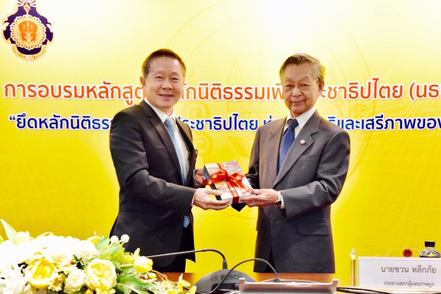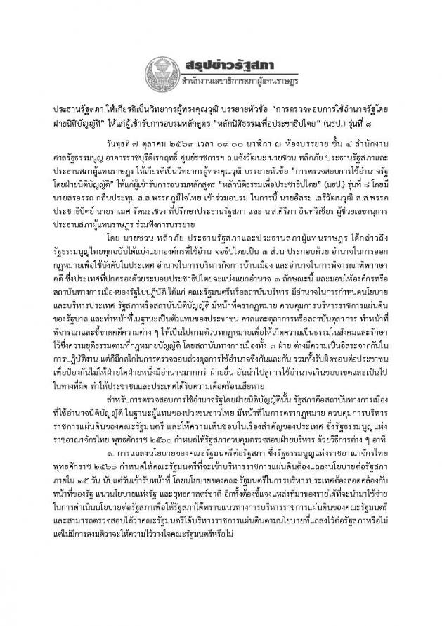 ประธานรัฐสภา ให้เกียรติเป็นวิทยากรผู้ทรงคุณวุฒิ บรรยายหัวข้อ “การตรวจสอบการใช้อำนาจรัฐโดยฝ่ายนิติบัญญัติ” ให้แก่ผู้เข้ารับการอบรมหลักสูตร “หลักนิติธรรมเพื่อประชาธิปไตย” (นธป.) รุ่นที่ ๘