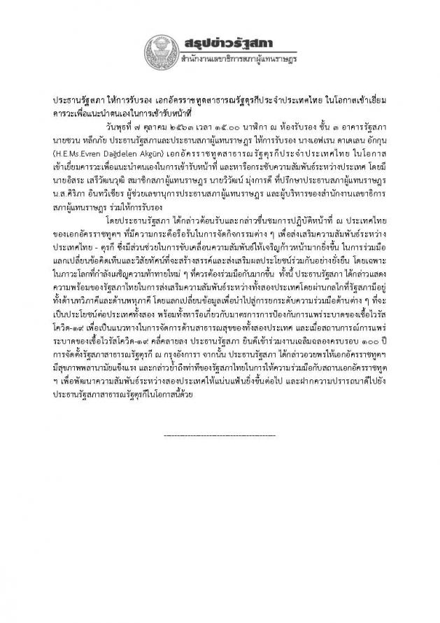 ประธานรัฐสภา ให้การรับรอง เอกอัครราชทูตสาธารณรัฐตุรกีประจำประเทศไทย ในโอกาสเข้าเยี่ยมคารวะเพื่อแนะนำตนเองในการเข้ารับหน้าที่