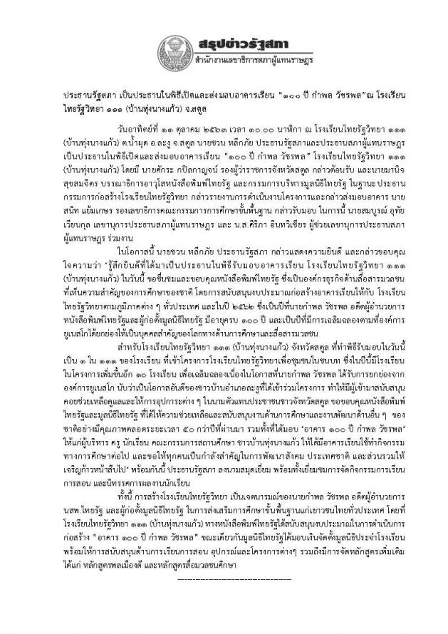 ประธานรัฐสภา เป็นประธานในพิธีเปิดและส่งมอบอาคารเรียน “๑๐๐ ปี กำพล วัชรพล”ณ โรงเรียนไทยรัฐวิทยา ๑๑๑ (บ้านทุ่งนางแก้ว) จ.สตูล