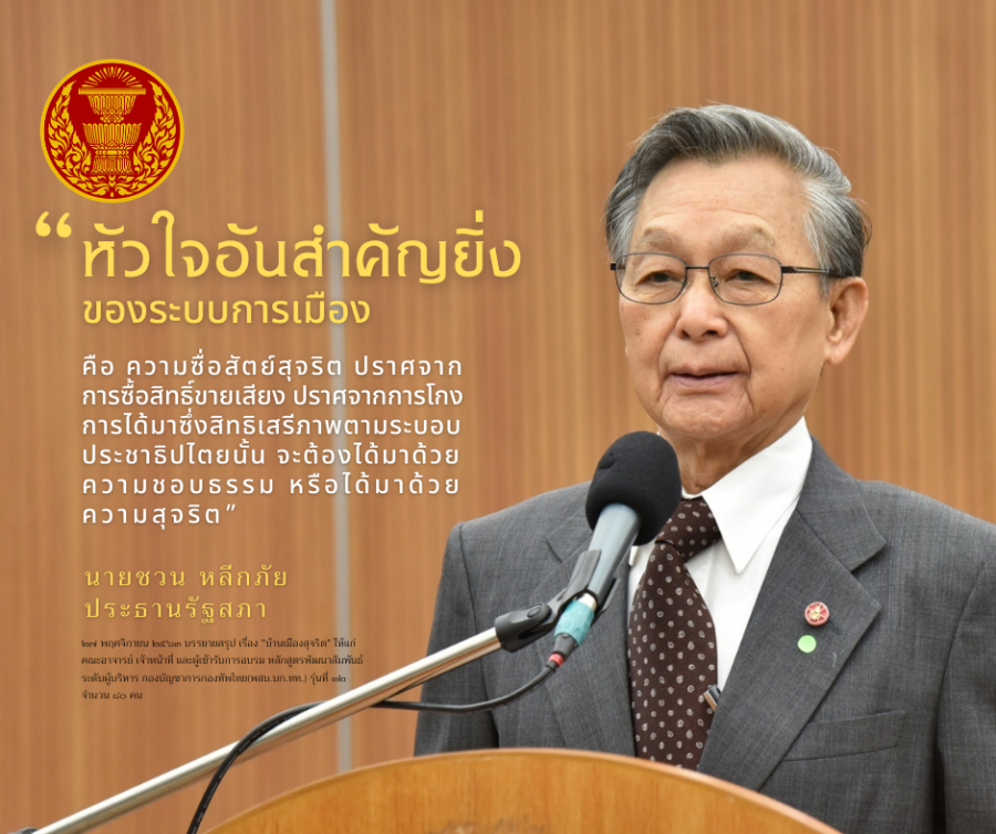 ประธานรัฐสภา บรรยายสรุป เรื่อง บ้านเมืองสุจริต ให้แก่คณะอาจารย์ เจ้าหน้าที่ และผู้เข้ารับการอบรม หลักสูตรพัฒนาสัมพันธ์ ระดับผู้บริหาร กองบัญชาการกองทัพไทย (พสบ.บก.ทท.) รุ่นที่ ๑๒